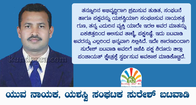 ತನ್ನ ಎದುರಿನ ವ್ಯಕ್ತಿ ಯಾರೇ ಇರಲಿ ಅವರ ಮಾತನ್ನು ಏಕಚಿತ್ತದಿಂದ ಆಲಿಸುವ ತಾಳ್ಮೆ, ಪಕ್ಷವನ್ನು ಯಶಸ್ವಿಯಾಗಿ ಸಂಘಟಿಸುವ ನಾಯಕತ್ವ ಗುಣ, ತನ್ನೂರಿನ ಅಭಿವೃದ್ಧಿಗಾಗಿ ಶ್ರಮಿಸುವ ತುಡಿತ ಈ ಎಲ್ಲಾ ಕಾರಣಗಳಿಂದಾಗಿ ಸುರೇಶ್ ಬಟವಾಡಿ ಬಿಜೆಪಿ ಪಕ್ಷದಿಂದ ಶಿರೂರು ಜಿಲ್ಲಾ ಪಂಚಾಯತ್ ಕ್ಷೇತ್ರಕ್ಕೆ ಸ್ವರ್ಧೆಗಿಳಿದಿದ್ದಾರೆ. ಲೇಖನ: ಸುನಿಲ್ ಹೆಚ್. ಜಿ. ಬೈಂದೂರು