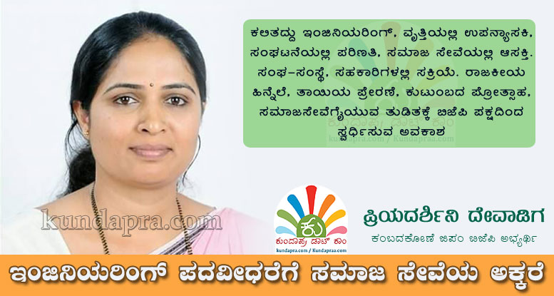 ಸೌಪರ್ಣಿಕಾ ಮಹಿಳಾ ಸಹಕಾರಿಯ ನಿರ್ದೇಶಕಿಯಾಗಿ, ಸಂಘ ಸಂಸ್ಥೆಗಳಲ್ಲಿ ತೊಡಗಿಸಿಕೊಂಡು ತ್ರಾಸಿ ಯುವತಿ ಮಂಡಲದ ಅಧ್ಯಕ್ಷೆಯಾಗಿದ್ದ ಪ್ರೀಯದರ್ಶಿನಿ ಅವರಿಗೆ ರಾಜಕೀಯದ ಹಿನ್ನೆಲೆಯೂ ಇದ್ದ ಕಾರಣ ಬಿಜೆಪಿ ಪಕ್ಷದಿಂದ ಸ್ವರ್ಧಿಸುವ ಅವಕಾಶ ದೊರೆತಿದೆ. ಸೂಕ್ತ ಸಮಯದಲ್ಲಿ ದೊರೆತ ಅವಕಾಶ, ಪಕ್ಷದಿಂದಲೂ ಸಹಕಾರ, ಕುಟುಂಬ ವರ್ಗದ ಪ್ರೋತ್ಸಾಹದಿಂದ ಗೆಲ್ಲುವ ವಿಶ್ವಾಸ ವ್ಯಕ್ತಪಡಿಸುತ್ತಿರುವ ಪ್ರಿಯದರ್ಶಿನಿ ಅವರಿಗೆ ಕಂಬದಕೋಣೆ ಜಿಪಂ ವ್ಯಾಪ್ತಿಯ ದೇವಾಡಿಗ ಸಮುದಾಯದ ಮತಗಳೇ ನಿರ್ಣಾಯಕವಾಗಲಿದೆ. ಕುಂದಾಪ್ರ ಡಾಟ್ ಕಾಂ ಲೇಖನ
