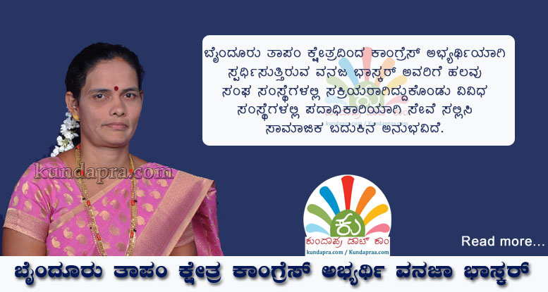 ಬೈಂದೂರು: ಕುಂದಾಪುರ ತಾಲೂಕು ಪಂಚಾಯತ್ನ ಬೈಂದೂರು ತಾಪಂ ಕ್ಷೇತ್ರಕ್ಕೆ ಕಾಂಗ್ರೆಸ್ ಪಕ್ಷದಿಂದ ವನಜ ಭಾಸ್ಕರ್ ಸ್ಪರ್ಧಿಸುತ್ತಿದ್ದಾರೆ. ಕುಂದಾಪ್ರ ಡಾಟ್ ಕಾಂ ಸುದ್ದಿ