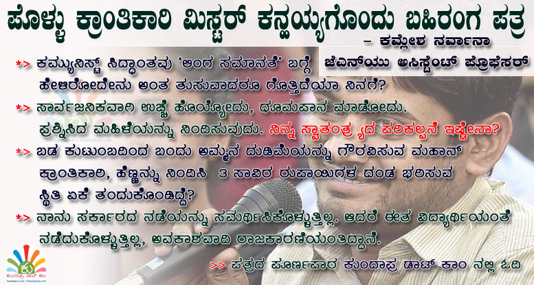 ನನ್ನ ಜೆಎನ್ಯು ಸಮುದಾಯವೆಲ್ಲ ಒಟ್ಟುಗೂಡಿ ಒಬ್ಬ ಪೊಳ್ಳು ಕ್ರಾಂತಿಕಾರಿಯನ್ನು ಸೃಷ್ಟಿಸುತ್ತಿರುವುದನ್ನು ನೋಡಿ ಈ ಪತ್ರ ಬರೆಯಲೇಬೇಕಾಗಿದೆ. ಜೆಎನ್ಯು ವಿದ್ಯಾರ್ಥಿ ಸಂಘಟನೆ ನಾಯಕ ಮಿ. ಕನ್ಹಯ್ಯ ಹಾಗೂ ಆತನನ್ನು ಈ ಶತಮಾನದ ಭಗತ್ ಸಿಂಗ್ ಅಂತ ಸಾಬೀತುಗೊಳಿಸುವುದಕ್ಕೆ ಒಟ್ಟಾಗಿರುವವರಿಗೆ ನಾನು ಈ ಪತ್ರ ಬರೆಯುತ್ತಿದ್ದೇನೆ. (ಕುಂದಾಪ್ರ ಡಾಟ್ ಕಾಂ)