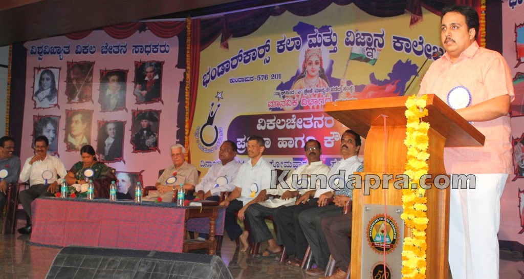 ಸೋಮವಾರ ಭಂಡಾರ್ಕಾರ್ಸ್ ಕಲಾ ಮತ್ತು ವಿಜ್ಞಾನ ಕಾಲೇಜಿನ ಮಾನವಿಕ ವಿಭಾಗದ ಆಶ್ರಯದಲ್ಲಿ ಆರ್.ಎನ್. ಶೆಟ್ಟಿ ಸಭಾಂಗಣದಲ್ಲಿ ಹಮ್ಮಿಕೊಂಡ ವಿಕಲಚೇತನರ ಸಮಾವೇಶ, ಪ್ರತಿಭಾ ಹಾಗೂ ಕೌಶಲ ಅನಾವರಣ ಕಾರ್ಯಕ್ರಮವನ್ನು ಉದ್ಘಾಟಿಸಿ ಮಾತನಾಡಿದರು.