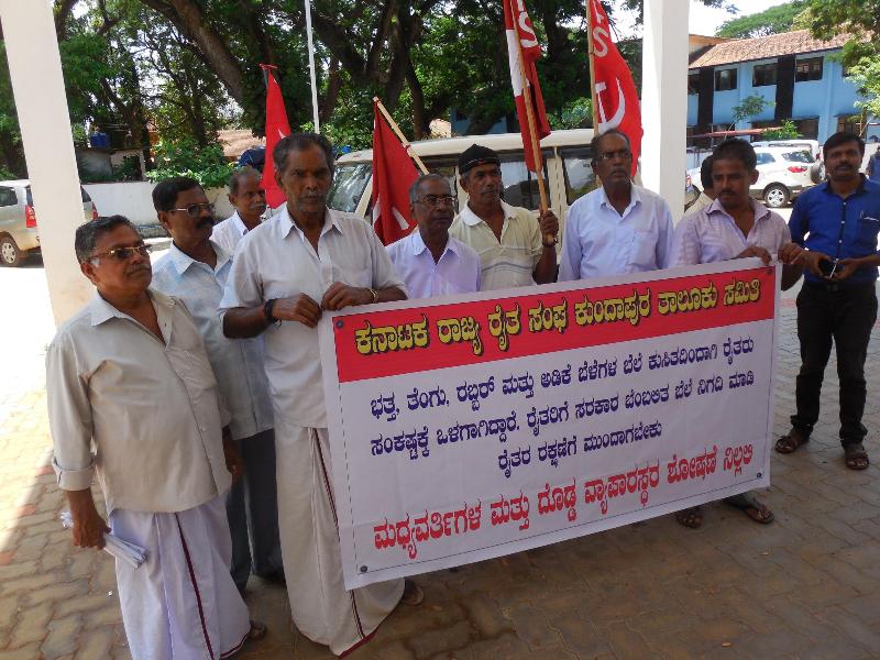 ರಾಜ್ಯವ್ಯಾಪಿ ಜರುಗುವ ಪ್ರತಿಭಟನಾ ಹೋರಾಟ ಕಾರ್ಯಕ್ರಮದ ಅಂಗವಾಗಿ ರೈತರ ಪ್ರಮುಖ ಬೇಡಿಕೆಗಳಾದ – ತೆಂಗು, ರಬ್ಬರ್, ಮತ್ತು ಅಡಿಕೆ ಬೆಳೆಗಾರರನ್ನು ರಕ್ಷಿಸಿ, ಬೆಳೆಗೆ ಬೆಲೆ ಹೆಚ್ಚಳ ಮಾಡಬೇಕು. ನಮೂನೆ 50 ಮತ್ತು 53 ರಲ್ಲಿ ಅಕ್ರಮ ಸಕ್ರಮಿಕರಣ ಕೋರಿ ಅರ್ಜಿ ಸಲ್ಲಿಸಿದ ಬಡ ರೈತರಿಗೆ ಕೂಡಲೇ ಭೂಮಿ ಮಂಜೂರಾತಿ ಹಕ್ಕು ಪತ್ರ ನೀಡಬೇಕು. ಕುಂದಾಪುರ ತಾಲೂಕಿನ ರಬ್ಬರ್ ಮತ್ತು ಅಡಿಕೆ ಕೃಷಿಕರು ಸಾಲ ಬಾಧೆಯಿಂದ ೫ ಮಂದಿ ಆತ್ಮಹತ್ಯೆ ಮಾಡಿಕೊಂಡ ರೈತ ಕುಟುಂಬಕ್ಕೆ ಪರಿಹಾರ ಧನ ಮಂಜೂರು ಮಾಡಬೇಕು. ಮಧ್ಯವರ್ತಿ ಶ್ರೀಮಂತ ವ್ಯಾಪಾರಸ್ತರ ಲಾಭಕೋರ ನೀತಿಯನ್ನು ತಡೆಗಟ್ಟಬೇಕು. ಇತ್ಯಾದಿ ಬೇಡಿಕೆಗಳ ಮನವಿಯನ್ನು ಸಹಾಯಕ ಕಮಿಷನ್ರವರಿಗೆ ಹಸ್ತಾಂತರಿಸಲಾಯಿತು.