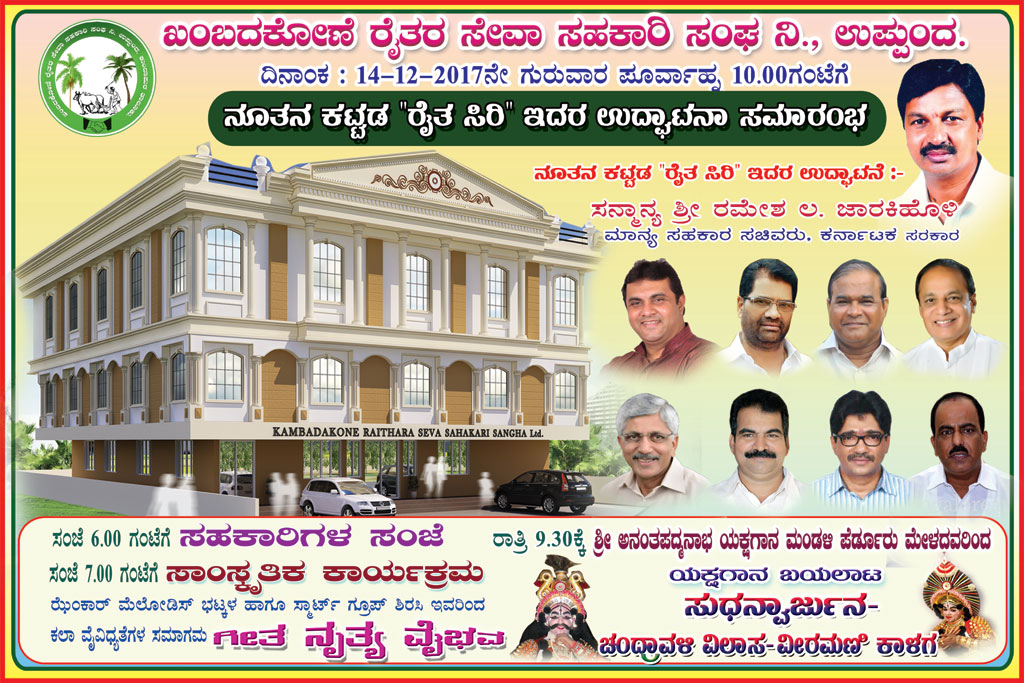 ರಾಜ್ಯ ಸಹಕಾರ ಸಚಿವ ರಮೇಶ ಜಾರಕಿಹೋಳಿ ಉದ್ಘಾಟಿಸಲಿದ್ದು, ಪ್ರಧಾನ ಕಛೇರಿಯನ್ನು ಮೀನುಗಾರಿಕೆ ಮತ್ತು ಯುವಜನ ಸಬಲೀಕರಣ ಸಚಿವ ಪ್ರಮೋದ ಮಧ್ವರಾಜ್ ಉದ್ಘಾಟಿಸಲಿದ್ದಾರೆ. ಬ್ಯಾಂಕಿಂಗ್ ವಿಭಾಗವನ್ನು ಕ.ರಾ.ಸ.ಮಾರಾಟ ಮಹಾಮಂಡಳಿ ಅಧ್ಯಕ್ಷ ಡಾ|ಎಂ.ಎನ್.ರಾಜೇಂದ್ರ ಕುಮಾರ್ ಉದ್ಘಾಟಿಸಲಿದ್ದಾರೆ. ಕಾರ್ಯಕ್ರಮದ ಅಧ್ಯಕ್ಷತೆಯನ್ನು ಖಂಬದಕೋಣೆ ರೈತರ ಸೇವಾ ಸಹಕಾರಿ ಸಂಘದ ಅಧ್ಯಕ್ಷ ಎಸ್.ಪ್ರಕಾಶ್ಚಂದ್ರ ಶೆಟ್ಟಿ ವಹಿಸಲಿದ್ದಾರೆ. ರೈತಸಿರಿ ಸಭಾಭವನವನ್ನು ಶಾಸಕ ಕೆ.ಗೋಪಾಲ ಪೂಜಾರಿ, ರೈತರ ಉತ್ಪತ್ತಿ ದಾಸ್ತಾನು ಮತ್ತು ಕೃಷಿ ಸಲಕರಣೆ ಮಳಿಗೆಯನ್ನು ಮಾಜಿ ಸಚಿವ ವಿನಯಕುಮಾರ ಸೊರಕೆ, ನ್ಯಾಯಬೆಲೆ ಅಂಗಡಿಯನ್ನು ಮಾಜಿ ಸಂಸದ ಜಯಪ್ರಕಾಶ್ ಹೆಗ್ಡೆ, ನೂತನ ಗಣಕೀಕರಣ ಕೇಂದ್ರವನ್ನು ಸಹಕಾರಿ ಯೂನಿಯನ್ ಅಧ್ಯಕ್ಷ ಕಿಶನ್ ಹೆಗ್ಡೆ, ಭದ್ರತಾ ಕೋಶವನ್ನು ದ.ಕ ಹಾಲು ಉತ್ಪಾದಕರ ಒಕ್ಕೂಟದ ಅಧ್ಯಕ್ಷ ಕೆ.ರವಿರಾಜ ಹೆಗ್ಡೆ ಉದ್ಘಾಟಿಸಲಿದ್ದಾರೆ.
