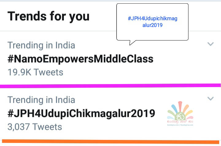 ಜಯಪ್ರಕಾಶ್ ಹೆಗ್ಡೆಯವರು ಸಂಸದರಾಗಿ ಸಚಿವರಾಗಿ ಶಾಸಕರಾಗಿ ಹಿರಿಯ ರಾಜಕೀಯ ಅನುಭವಿಗಳು ಹಾಗೂ ಕ್ಷೇತ್ರದ ಬಗ್ಗೆ ಸಮಗ್ರ ಪರಿಚಯ ಹೊಂದಿರುತ್ತಾರೆ, ತಳಮಟ್ಟದ ಕಾರ್ಯಕರ್ತರೊಂದಿಗೆ ಸಂಪರ್ಕ ಹೊಂದಿರುವ ಅವರ ಆಡಳಿತವನ್ನು ಹಿಂದೊಮ್ಮೆ ಜನತೆ ನೋಡಿದ್ದಾರೆ. ಅಂತಹ ಜನಸ್ಪಂದನೆಯ ನಾಯಕರು ನಮಗೆ ಇನ್ನೊಮ್ಮೆ ಬೇಕು ಎಂಬಂತೆ ಉಡುಪಿ ಹಾಗೂ ಚಿಕ್ಕಮಗಳೂರು ಜಿಲ್ಲೆಯ ಕಾರ್ಯಕರ್ತರು ಧ್ವನಿಸಿದ್ದಾರೆ. ಅವರಿಗೆ ನೀವು ಟೀಕೆಟ್ ನೀಡಿ, ಜಯಗೊಳಿಸುವುದು ನಮ್ಮ ಕರ್ತವ್ಯ ಎಂಬಂತೆ ಬಿಜೆಪಿ ಕಾರ್ಯಕರ್ತರು ಟ್ವೀಟ್ ಮಾಡಿದ್ದಾರೆ. #JPH4UdupiChikmagalur2019 ಹ್ಯಾಷ್ ಟ್ಯಾಗ್’ನಲ್ಲಿ ಒಟ್ಟು ಮೂರು ಸಾವಿರಕ್ಕೂ ಹೆಚ್ಚು ಟ್ವೀಟ್ಗಳೂ ಬಂದಿವೆ ಇನ್ನೂ ಹೆಚ್ಚುತ್ತಲೆ ಇದೆ. ಅದು ರಾಷ್ಟ್ರಮಟ್ಟದಲ್ಲಿ ಎಂಟನೇ ಸ್ಥಾನ ಮತ್ತು ರಾಜ್ಯದಲ್ಲಿ ಎರಡನೇ ಸ್ಥಾನ ಪಡೆದು ಟ್ರೆಂಡ್ ಆಗಿದ್ದು ಬಹು ಮೆಚ್ಚುಗೆಯಾಗಿತ್ತು.