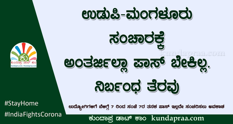 ► ಅಂತರಾಜ್ಯ ಸಂಚಾರಕ್ಕೆ ಸೇವಾಸಿಂಧುವಿನಲ್ಲಿ ನೊಂದಣಿ ಅಗತ್ಯ – https://kundapraa.com/?p=37276 .