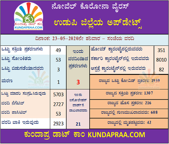 ಉಡುಪಿ: ಉಡುಪಿ ಜಿಲ್ಲೆಯಲ್ಲಿ ಮೇ.23ರಂದು 3 ಹೊಸ ಕೊರೋನಾ ಪಾಸಿಟಿವ್ ಪ್ರಕರಣಗಳು ವರದಿಯಾಗಿದೆ. ಈ ಪೈಕಿ ಮುಂಬೈನಿಂದ ಬಂದಿದ್ದ ಹಾಗೂ ವಿದೇಶದಿಂದ ಬಂದಿದ್ದ ಓರ್ವರಿಗೆ ಸೋಂಕು ಇರುವುದು ದೃಢಪಟ್ಟಿದೆ.