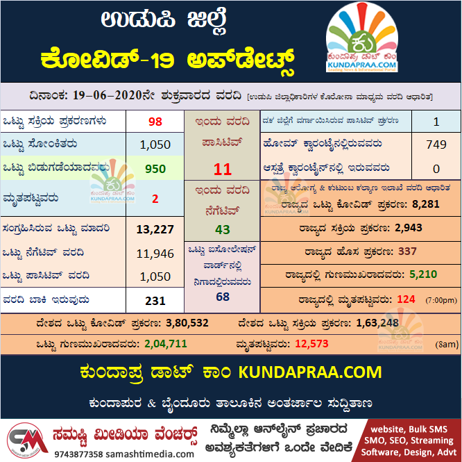 ಈ ತನಕ ಒಟ್ಟು 13,227ಮಾದರಿ ಸಂಗ್ರಹಿಸಿದ್ದು, ಅವುಗಳಲ್ಲಿ 11,946 ನೆಗೆಟಿವ್, 1050 ಪಾಸಿಟಿವ್ ಬಂದಿದ್ದು, 231 ಮಂದಿಯ ವರದಿ ಬರುವುದು ಬಾಕಿ ಇದೆ. ಇಂದು ಬಂದಿರುವ ವರದಿಯಲ್ಲಿ 43 ನೆಗೆಟಿವ್, 11 ಪಾಸಿಟಿವ್ ಬಂದಿದೆ.