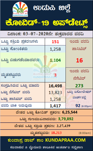 ಈ ತನಕ ಒಟ್ಟು 16,498 ಮಾದರಿ ಸಂಗ್ರಹಿಸಿದ್ದು, ಅವುಗಳಲ್ಲಿ 13,823 ನೆಗೆಟಿವ್, 1,258 ಪಾಸಿಟಿವ್ ಬಂದಿದ್ದು, 1,417 ಮಂದಿಯ ವರದಿ ಬರುವುದು ಬಾಕಿ ಇದೆ. ಇಂದು ಬಂದಿರುವ ವರದಿಯಲ್ಲಿ 273 ನೆಗೆಟಿವ್, 16 ಪಾಸಿಟಿವ್ ಬಂದಿದೆ. ಒಟ್ಟು 1034 ಮಂದಿ ಹೋಮ್ ಕ್ವಾರಂಟೈನಿನಲ್ಲಿದ್ದಾರೆ.