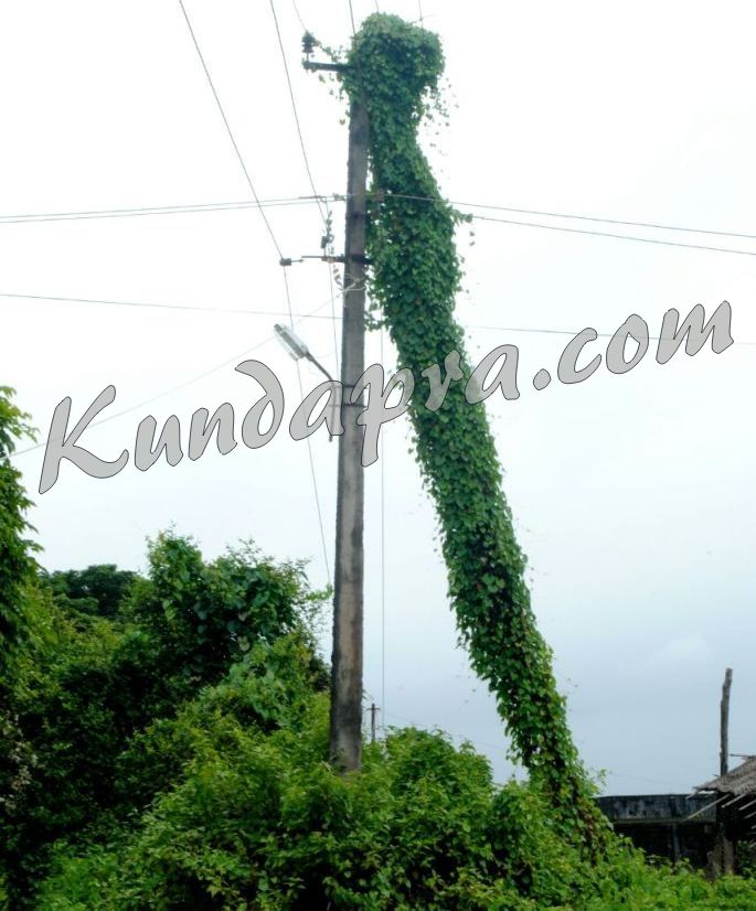 ಗಂಗೊಳ್ಳಿ: ನೆಲದ ಮೇಲೆ ಬೆಳೆದ ಹೂಬಳ್ಳಿಗಳು ಗಿಡ ಗಂಟಿಗಳು ಹತ್ತಿರದಲ್ಲಿರುವ ಮನೆ, ಅಂಗಡಿ ಮುಗ್ಗಟ್ಟು ಅಥವಾ ಕಂಬಗಳನ್ನು ಹತ್ತಿ ಬೆಳೆಯುವುದು ಮಳೆಗಾಲದಲ್ಲಿ ಸಾಮಾನ್ಯ. ಆದರೆ ಗಂಗೊಳ್ಳಿಯ ಮ್ಯಾಂಗನೀಸ್ ರಸ್ತೆಯ ಶ್ರೀ ಚಕ್ರೇಶ್ವರಿ ದೇವಸ್ಥಾನದ ಸಮೀಪದಲ್ಲಿರುವ ವಿದ್ಯುತ್ ಕಂಬವೊಂದರ ಮೇಲೆ ಬಳ್ಳಿಗಳು ದೊಡ್ಡದಾಗಿ ಬೆಳೆದು ವಿದ್ಯುತ್ ತಂತಿ ಸಮೇತ ಕಂಬವನ್ನು ಆವರಿಸುತ್ತಿದೆ.