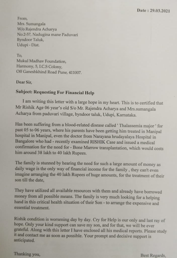 ಕುಂದಾಪುರ: ಪಡುವರಿ ಗ್ರಾಮದ ಸುಮಂಗಲ ಆಚಾರ್ಯ ಮತ್ತು ರಾಜೇಶ್ ಆಚಾರ್ಯ ಮಗನಾದ ರಿಷಿಕ್ ಇವನು ಪಡುಕೋಣೆಯ ಸರಕಾರಿ ಹಿರಿಯ ಪ್ರಾಥಮಿಕ ಶಾಲೆಯಲ್ಲಿ ವಿದ್ಯಭ್ಯಾಸ ಮಾಡುತಿದ್ದು ಕಳೆದ 5ವರ್ಷದಿಂದ ಥಲಸ್ಸಿಮಿಯಾ ಖಾಯಿಲೆಯಿಂದ ಬಳಲುತ್ತಿದ್ದು ಇತ್ತೀಚೆಗೆ ಬೆಂಗಳೂರಿನ ನಾರಾಯಣ ಹೃದಯಾಲಯದಲ್ಲಿ ತಪಾಸಣೆ ನಡೆಸಿದ ವೈದ್ಯರು ಅಸ್ಥಿಮಜ್ಜೆ ಚಿಕಿತ್ಸೆ ಮಾಡಬೇಕೆಂದು ವೈದ್ಯಕೀಯ ಪ್ರಮಾಣ ಪತ್ರ ನೀಡಿದ್ದಾರೆ. ಚಿಕಿತ್ಸೆಗಾಗಿ 35ರಿಂದ 40ಲಕ್ಷ ವೆಚ್ಚವಾಗುವುದೆಂದು ವೈದ್ಯರು ತಿಳಿಸಿರುತ್ತಾರೆ ಅವರ ವೈದ್ಯಕೀಯ ಚಿಕಿತ್ಸೆಗೆ ಮಾನವೀಯ ನೆರವಿನ ಅಗತ್ಯವಿದೆ.