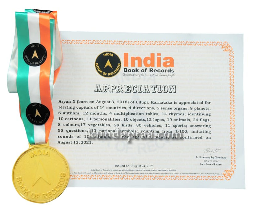 ಕುಂದಾಪುರ: ಮೂರು ವರ್ಷದ ಪೋರ ಆರ್ಯನ್ ಹೆಸರು ಇಂಡಿಯಾ ಬುಕ್ ಆಫ್ ರೆಕಾರ್ಡ್ಸ್ನಲ್ಲಿ ದಾಖಲಾಗಿದೆ. ದೇಶಗಳು, ರಾಜ್ಯಗಳು, ರಾಜಧಾನಿ, ಜಿಲ್ಲೆ, ಬಣ್ಣ, ವರ್ಣಮಾಲೆ ಸೇರಿದಂತೆ ಹಲವು ವಿಷಯಗಳ ಬಗ್ಗೆ ಪಟಪಟನೆ ಉತ್ತರಿಸುವ ಹಾಗೂ ಗುರುತಿಸುವ ಆರ್ಯನ್, ಅಧಿಕ ಜ್ಞಾಪನಾ ಶಕ್ತಿಯ ಕಾರಣಕ್ಕೆ ಇಂಡಿಯಾ ಬುಕ್ ಆಫ್ ರೆಕಾರ್ಡ್ಸ್ ಸೇರಿ ಈ ದಾಖಲೆ ಮಾಡಿದ್ದಾನೆ. ಕುಂದಾಪ್ರ ಡಾಟ್ ಕಾಂ ಸುದ್ದಿ.