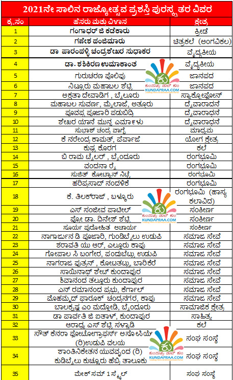 ಈ ಪೈಕಿ ಕುಂದಾಪುರ ತಾಲೂಕಿನ ಡಾ. ದಿನೇಶ್ ಶೆಟ್ಟಿ ಅವರಿಗೆ ಸಂಕೀರ್ಣ ಕ್ಷೇತ್ರದಲ್ಲಿ, ಕೆ. ತಿಲಕರಾಜ್ ಬಳ್ಕೂರು ಅವರಿಗೆ ರಂಗಭೂಮಿ ಕ್ಷೇತ್ರದಲ್ಲಿ ಸಾಯಿನಾಥ್ ಶೇಟ್ ಅವರಿಗೆ ಸಮಾಜ ಸೇವೆ ಕ್ಷೇತ್ರ, ಶಿವಾನಂದ ತಲ್ಲೂರು ಅವರಿಗೆ ಸಮಾಜ ಸೇವೆ ಕ್ಷೇತ್ರ, ಡಾ. ಪಾರ್ವತಿ ಜಿ. ಐತಾಳ್ ಅವರಿಗೆ ಸಾಹಿತ್ಯ ಕ್ಷೇತ್ರ, ಆರಾಧ್ಯ ಎಸ್. ಶೆಟ್ಟಿ ಅವರಿಗೆ ಕಲಾ ಕ್ಷೇತ್ರದಲ್ಲಿ ಪ್ರಶಸ್ತಿ ದೊರೆತಿದೆ.
