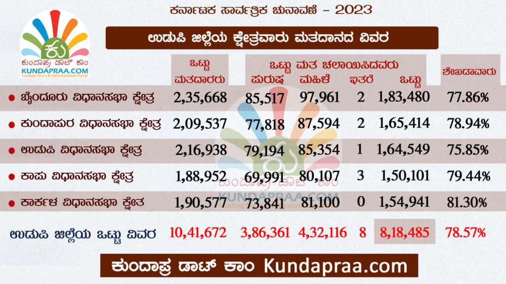 ಕುಂದಾಪುರ: ಕರ್ನಾಟಕ ಸಾರ್ವತ್ರಿಕ ಚುನಾವಣೆ -2023ರಲ್ಲಿ ಉಡುಪಿ ಜಿಲ್ಲೆಯಲ್ಲಿ ಒಟ್ಟು ಶೇ. 78.57ಮತದಾನವಾಗಿದೆ.