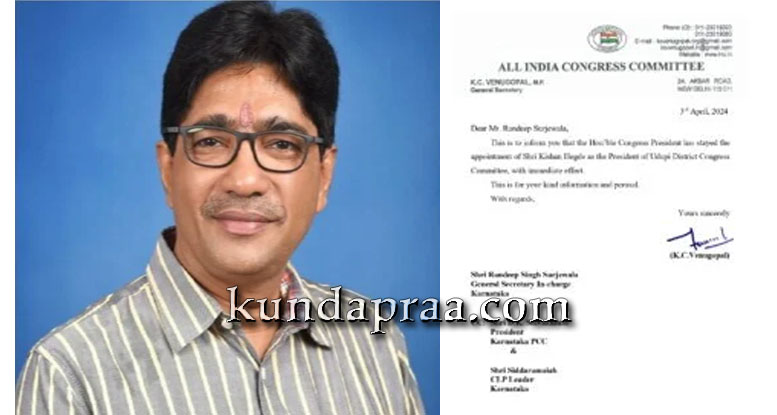 ಎರಡು ದಿನಗಳ ಹಿಂದಷ್ಟೇ ಕಿಶನ್ ಹೆಗ್ಡೆ ಕೊಳ್ಕೆಬೈಲು ಅವರು ಉಡುಪಿ ಜಿಲ್ಲಾಧ್ಯಕ್ಷನ್ನಾಗಿ ನೇಮಕ ಮಾಡಲಾಗಿತ್ತು. ಆದರೆ ಅವರ ಆಯ್ಕೆ ಕಾಂಗ್ರೆಸ್ ವಲಯದಲ್ಲಿ ಭಾರಿ ಅಸಮಾಧಾನಕ್ಕೆ ಕಾರಣವಾಗಿತ್ತು. ಈ ಹಿನ್ನೆಲೆಯಲ್ಲಿ ಕಾಂಗ್ರೆಸ್ ರಾಷ್ಟ್ರೀಯ ಪ್ರಧಾನ ಕಾರ್ಯದರ್ಶಿ ಕೆ.ಸಿ. ವೇಣುಗೋಪಾಲ್ ಅವರು ರಾಜ್ಯ ಕಾಂಗ್ರೆಸ್ ಉಸ್ತುವಾರಿ ರಾಣದೀಪ್ ಸಿಂಗ್ ಸುರ್ಜೇವಾಲ ಅವರಿಗೆ ಪತ್ರ ಬರೆದು ಯಥಾಸ್ಥಿತಿ ಕಾಯ್ದುಕೊಳ್ಳುವಂತೆ ಸೂಚಿಸಿದ್ದಾರೆ.