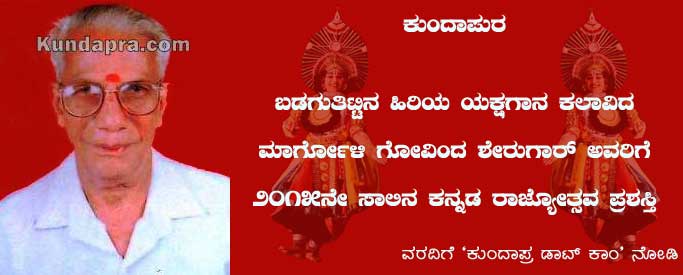 ಕುಂದಾಪುರ: ಬಡಗುತಿಟ್ಟಿನ ಹಿರಿಯ ಯಕ್ಷಗಾನ ಕಲಾವಿದ, ಸ್ತ್ರೀಪಾತ್ರಗಳ ಮೂಲಕ ತನ್ನ ಕಲಾವರ್ಚಸ್ಸನ್ನು ಅಸಂಖ್ಯ ಯಕ್ಷಪ್ರೀಯರಿಗೆ ಉಣಬಡಿಸಿದ ಕಲಾವಿದ ಕುಂದಾಪುರ ತಾಲೂಕಿನ ಮಾರ್ಗೋಳಿ ಗೋವಿಂದ ಶೇರುಗಾರ್ ಅವರಿಗೆ 2015ನೇ ಸಾಲಿನ ಕನ್ನಡ ರಾಜ್ಯೋತ್ಸವ ಪ್ರಶಸ್ತಿ ಸಂದಿದೆ.