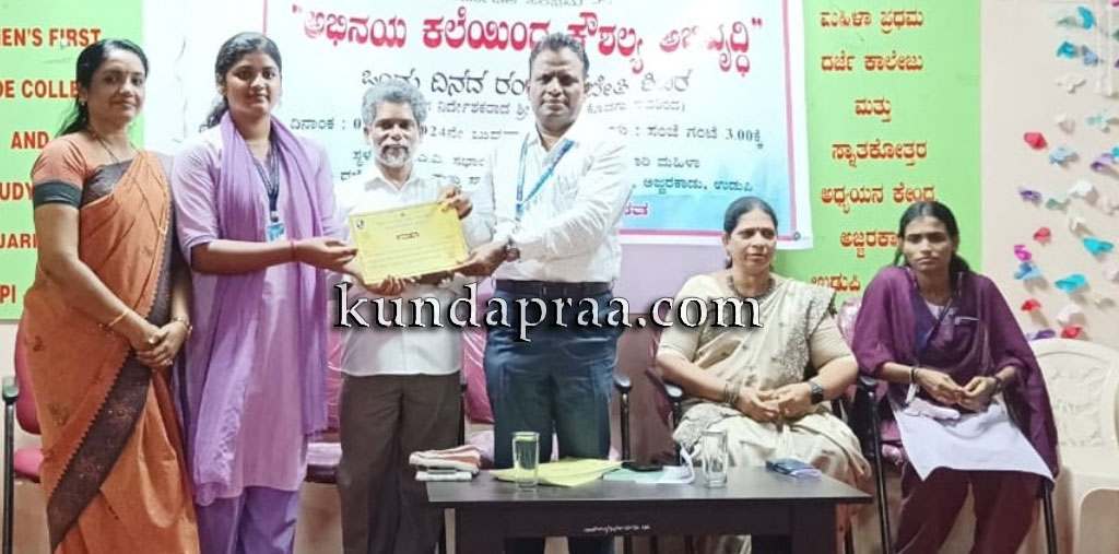 ಅವರು ಯಕ್ಷ ರಂಗಾಯಣ ಕಾರ್ಕಳ ವತಿಯಿಂದ ನಗರದ ಅಜ್ಜರಕಾಡು ಡಾ.ಜಿ. ಶಂಕರ್ ಸರಕಾರಿ ಮಹಿಳಾ ಪ್ರಥಮ ದರ್ಜೆ ಕಾಲೇಜು ಮತ್ತು ಸ್ನಾತಕೋತ್ತರ ಅಧ್ಯಯನ ಕೇಂದ್ರದ ಪಿ.ಜಿ.ಎ.ವಿ. ಸಭಾಂಗಣದಲ್ಲಿ ನಡೆದ ಅಭಿನಯ ಕಲೆಯಿಂದ ಕೌಶಲ್ಯ ಅಭಿವೃದ್ಧಿ- ಒಂದು ದಿನದ ರಂಗ ತರಬೇತಿ ಶಿಬಿರದ ಸಮಾರೋಪ ಸಮಾರಂಭದ ಅಧ್ಯಕ್ಷತೆ ವಹಿಸಿ ಮಾತನಾಡಿದರು.