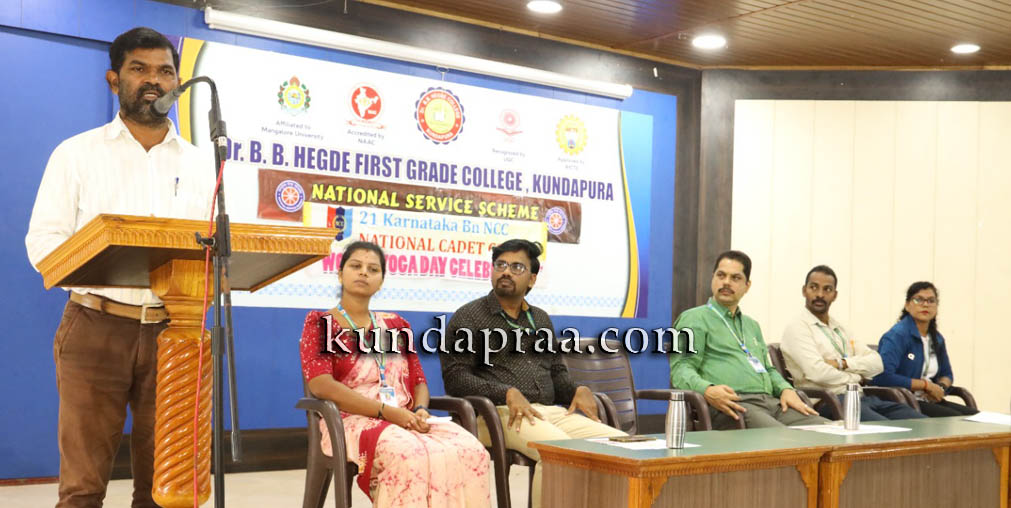 ಕುಂದಾಪುರದ ಡಾ| ಬಿ.ಬಿ. ಹೆಗ್ಡೆ ಪ್ರಥಮ ದರ್ಜೆ ಕಾಲೇಜಿನ ರಾಷ್ಟ್ರೀಯ ಸೇವಾ ಯೋಜನಾ ಘಟಕ ಎನ್.ಸಿ.ಸಿ. ಘಟಕ ಹಾಗೂ ಯೋಗ ಮತ್ತು ಫಿಟ್ನೆಸ್ ಸರ್ಟಿಫಿಕೇಟ್ ಕೋರ್ಸ್ನ ಸಂಯುಕ್ತ ಆಶ್ರಯದಲ್ಲಿ ನಡೆದ ‘ವಿಶ್ವಯೋಗ ದಿನʼವನ್ನು ಉದ್ದೇಶಿಸಿ ಮಾತನಾಡಿದರು. ಇದೇ ಸಂದರ್ಭ ಯೋಗದಿಂದಾಗುವ ಪ್ರಯೋಜನಗಳನ್ನು ತಿಳಿಸಿ, ಸಭಾ ಕಾರ್ಯಕ್ರಮದ ನಂತರ ವಿದ್ಯಾರ್ಥಿಗಳಿಗೆ ಯೋಗ ತರಬೇತಿ ನೀಡಿದರು.