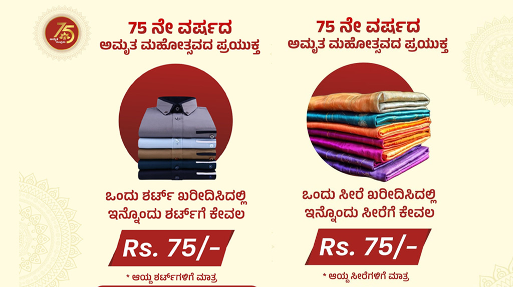 ಒಂದು ಸೀರೆ ಖರೀದಿಸಿದಲ್ಲಿ ಇನ್ನೊಂದು ಸೀರೆಗೆ ಕೇವಲರೂ.75 ಮಾತ್ರ ಪಾವತಿಸುವುದು, ಒಂದು ಶರ್ಟ್ ಖರೀದಿಸಿದಲ್ಲಿ ಇನ್ನೊಂದು ಶರ್ಟಿಗೆ ರೂ.75 ಮಾತ್ರ ಪಾವತಿಸುವ ವಿಶೇಷ ಆಫರ್ ಜುಲೈ 16ರಿಂದ ಆರಂಭಗೊಂಡಿದೆ. ಕುರ್ತಿಸ್ ಮೇಲೆ ವಿಶೇಷ ರಿಯಾಯಿತಿ ನೀಡಲಾಗುತ್ತಿದೆ. ಆಯ್ದ ಉಡುಗೆಗಳ ಮೇಲೆ ಮಾತ್ರ ಈ ಆಫರ್ ಇರಲಿದೆ.