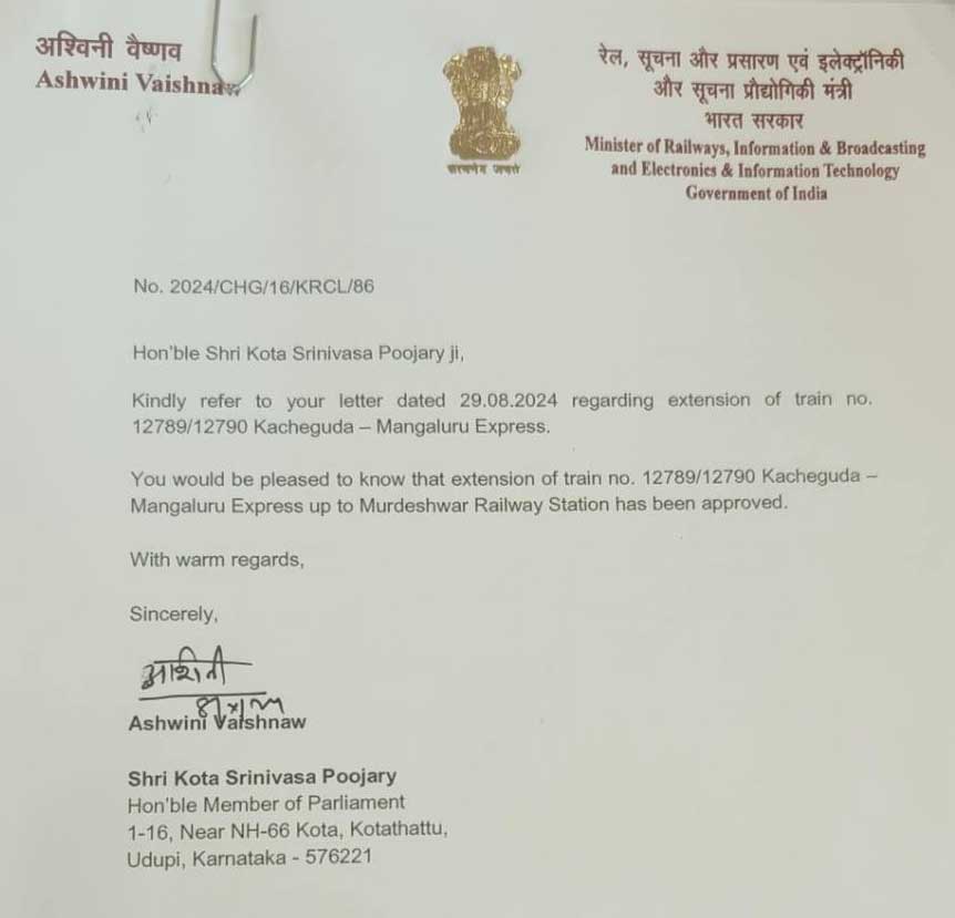 ವಾರದಲ್ಲಿ 2 ದಿನ ಸಂಚರಿಸುವ ಕಾಚಿಗುಡ – ಮಂಗಳೂರು ಸೆಂಟ್ರಲ್ ಎಕ್ಸ್ಪ್ರೆಸ್ ರೈಲು ಮಂಗಳವಾರ ಮತ್ತು ಶುಕ್ರವಾರ ಬೆಳಿಗ್ಗೆ 6-05ಕ್ಕೆ ಹೈದರಾಬಾದಿನ ಕಾಚಿಗುಡದಿಂದ ಹೊರಟು ತಿರುಪತಿಯ ರೇಣಿಗುಂಟ ನಿಲ್ದಾಣಕ್ಕೆ ಸಂಜೆ 4-45ಕ್ಕೆ ತಲುಪಿ ಅಲ್ಲಿಂದ ಮಂಗಳೂರು ಸೆಂಟ್ರಲ್ ನಿಲ್ದಾಣಕ್ಕೆ ಬುಧವಾರ ಮತ್ತು ಗುರುವಾರ ಬೆಳಿಗ್ಗೆ 9-30ಕ್ಕೆ ತಲುಪುತ್ತಿತ್ತು. ಮಂಗಳೂರು ಸೆಂಟ್ರಲ್ ನಿಲ್ದಾಣದಿಂದ ರಾತ್ರಿ 8-05ಕ್ಕೆ ಹೊರಟು ಮರುದಿನ ಬೆಳಿಗ್ಗೆ 11-45ಕ್ಕೆ ತಿರುಪತಿಯ ರೇಣಿಗುಂಟ ನಿಲ್ದಾಣ ತಲುಪುತ್ತಿತ್ತು. ಇದೀಗ ಕಾಚಿಗುಡ – ಮಂಗಳೂರು ಸೆಂಟ್ರಲ್ ರೈಲನ್ನು (12789 / 12790) ಮುರುಡೇಶ್ವರ ತನಕ ವಿಸ್ತರಣೆ ಮಾಡುವ ಸಂಸದರ ಕೋರಿಕೆಯನ್ನು ಮನ್ನಿಸಿ ಭಾರತೀಯ ರೈಲ್ವೆ ವಿಸ್ತರಣೆಗೆ ಆದೇಶ ಮಾಡಿದೆ.