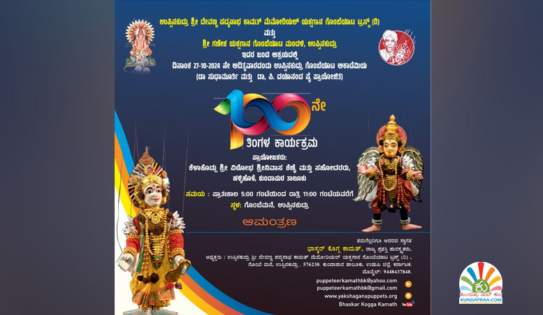 ಉಪ್ಪಿನಕುದ್ರು ಶ್ರೀ ದೇವಣ್ಣ ಪದ್ಮನಾಭ ಕಾಮತ್ ಮೆಮೋರಿಯಲ್ ಯಕ್ಷಗಾನ ಟ್ರಸ್ಟ್ ಮತ್ತು ಗಣೇಶ ಯಕ್ಷಗಾನ ಗೊಂಬೆಯಾಟ ಮಂಡಳಿಯ ಯಕ್ಷಗಾನ ಗೊಂಬೆಯಾಟ ಅಕಾಡೆಮಿ ಪ್ರತಿ ತಿಂಗಳು ಗೊಂಬೆಮನೆಯಲ್ಲಿ ಆಯೋಜಿಸುತ್ತಿದ್ದ ಸಾಂಸ್ಕೃತಿಕ ಕಾರ್ಯಕ್ರಮಗಳು 100 ತಿಂಗಳು ತಲುಪಿದ್ದು, 100ನೇ ಕಾರ್ಯಕ್ರಮವನ್ನು ಅದ್ದೂರಿಯಾಗಿ ಆಯೋಜಿಸಲಾಗಿದೆ. ಬೆಳಿಗ್ಗೆ 5ರಿಂದ ಉದಯರಾಗದಿಂದ ಆರಂಭಗೊಂಡು ಹಿಂದೂಸ್ತಾನಿ ಹಾಡುಗಳು, ಯಕ್ಷಗಾನದ ಹಾಡುಗಳ ಗಾಯನ, ಅಕಾಡೆಮಿಯ ವಿದ್ಯಾರ್ಥಿಗಳಿಂದ ಗೊಂಬೆಯಾಟ ಪ್ರಾತ್ಯಕ್ಷಿಕೆ, ಬೆಳಿಗ್ಗೆ 10ರಿಂದ ಭಕ್ತಿರಾಗ – ಭಕ್ತಿ ಸಂಗೀತ ಹಾಗೂ ಭಜನೆ, ಮಧ್ಯಾಹ್ನ 12-30ರಿಂದ ಶಾಲಾ ವಿದ್ಯಾರ್ಥಿಗಳಿಂದ ವೈವಿಧ್ಯಮಯ ಕಾರ್ಯಕ್ರಮ, ಪ್ರತಿಭಾನ್ವಿತರಿಂದ ಸಂಗೀತ, ಕೊಳಲು ವಾದನ, ಸಂಜೆ 5ರಿಂದ ಭಕ್ತಿ ಸಂಗೀತ, ಬಳಿಕ ಭಾವಗೀತೆ, ಸಂಜೆ 6ರಿಂದ 8:30ರ ತನಕ ಸಂಧ್ಯಾರಾಗ ಸಂಧ್ಯಾರಾಗ, ಬಳಿಕ ಯಕ್ಷಗಾನ ಪ್ರದರ್ಶನ ಇರಲಿದೆ.