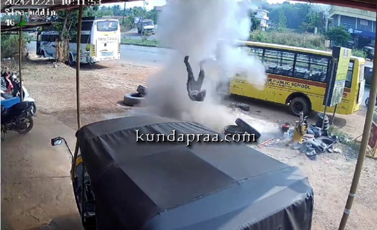 ಕೋಟೇಶ್ವರದಲ್ಲಿರುವ ಟೈರ್ ಪಂಕ್ಚರ್ ಶಾಪ್ ಗೆ ಖಾಸಗಿ ಶಾಲಾ ಬಸ್ಸೊಂದರ ಟೈರ್ ಪ್ಯಾಚ್ ಗೆ ಬಂದಿತ್ತು. ಈ ವೇಳೆ ಅಬ್ದುಲ್ ರಶೀದ್ ಟೈರನ್ನು ಬಸ್ಸಿನಿಂದ ಕೆಳಗಿಳಿಸಿ ಗಾಳಿ ತುಂಬಿಸಿದ್ದಾರೆ. ಗಾಳಿ ತುಂಬಿಸಿ ರಶೀದ್ ಅಲ್ಲಿಂದ ಎದ್ದೇಳುತ್ತಿದ್ದಂತೆ ಟೈರ್ ಏಕಾಏಕಿ ಸ್ಫೋಟಗೊಂಡಿದೆ. ಟೈರ್ ಸಿಡಿದ ರಭಸಕ್ಕೆ ರಶೀದ್ ಗಾಳಿಯಲ್ಲಿ ಹಾರಿ ಗಿರಕಿ ಹೊಡೆದು ಬಿದ್ದಿರುವುದು ಸಿಸಿಟಿವಿ ಕ್ಯಾಮರಾದಲ್ಲಿ ಸೆರೆಯಾಗಿದೆ.