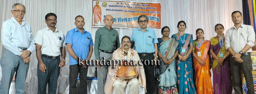 ಜಿ.ಎಸ್.ವಿ.ಎಸ್.ಅಸೋಸಿಯೇಶನ್ ಗಂಗೊಳ್ಳಿ ಸರಸ್ವತಿ ವಿದ್ಯಾಲಯ ವಿದ್ಯಾಸಂಸ್ಥೆಗಳು ಗಂಗೊಳ್ಳಿ ಮತ್ತು ಬಾಲಚಂದ್ರ ನಾಯ್ಕನಕಟ್ಟೆ ಟ್ರಸ್ಟ್ ಬೆಂಗಳೂರು ಇವರ ಜಂಟಿ ಆಶ್ರಯದಲ್ಲಿ ಶ್ರೀ ಸರಸ್ವತಿ ವಿದ್ಯಾನಿಧಿ ಗಂಗೊಳ್ಳಿ ಇವರ ಸಹಯೋಗದೊಂದಿಗೆ ಗಂಗೊಳ್ಳಿಯ ಗುಜ್ಜಾಡಿ ಗೋಪಾಲ ನಾಯಕ್ ರೋಟರಿ ಒಳಾಂಗಣ ಸಭಾಂಗಣದಲ್ಲಿ ಸೋಮವಾರ ನಡೆದ ಸ್ವಾಮಿ ವಿವೇಕಾನಂದ ಜಯಂತಿ ಕಾರ್ಯಕ್ರಮದಲ್ಲಿ ಅತಿಥಿಯಾಗಿ ಅವರು ಮಾತನಾಡಿದರು.