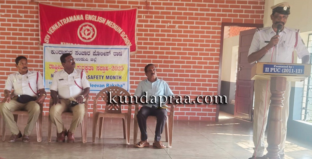 ಕುಂದಾಪುರ: ಶ್ರೀ ವೆಂಕಟರಮಣ ಆಂಗ್ಲ ಮಾಧ್ಯಮ ಪ್ರೌಢಶಾಲೆಯ ವಿದ್ಯಾರ್ಥಿಗಳಿಗೆ ರಾಷ್ಟ್ರೀಯ ರಸ್ತೆ ಸುರಕ್ಷತಾ ಸಪ್ತಾಹ 2025ರ ಪ್ರಯುಕ್ತ ಕುಂದಾಪುರ ಸಂಚಾರ ಪೋಲಿಸ್ ಠಾಣಾ ವತಿಯಿಂದ ರಸ್ತೆ ಸುರಕ್ಷತೆಯ ಬಗ್ಗೆ ಮಾಹಿತಿ ಕಾರ್ಯಕ್ರಮ ಆಯೋಜಿಸಲಾಯಿತು.