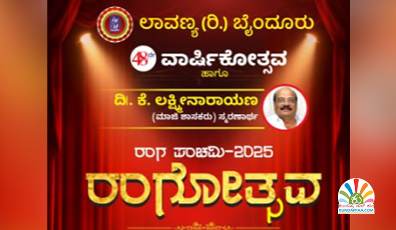 ಬೈಂದೂರು: ಇಲ್ಲಿನ ಲಾವಣ್ಯ ರಿ. ಬೈಂದೂರು 48ನೇ ವಾರ್ಷಿಕೋತ್ಸವ ಹಾಗೂ ಬೈಂದೂರು ಮಾಜಿ ಶಾಸಕ ದಿ. ಕೆ. ಲಕ್ಷ್ಮೀನಾರಾಯಣ ಸ್ಮರಣಾರ್ಥ “ರಂಗಪಂಚಮಿ-2025” ರಂಗತೋತ್ಸವ ಮಾರ್ಚ್ 1 ರಿಂದ 5ರ ವರೆಗೆ ಶ್ರೀ ಶಾರಾದಾ ವೇದಿಕೆಯಲ್ಲಿ ಪ್ರತಿದಿನ ಸಂಜೆ 6.30ಕ್ಕೆ ನಡೆಯಲಿದೆ.