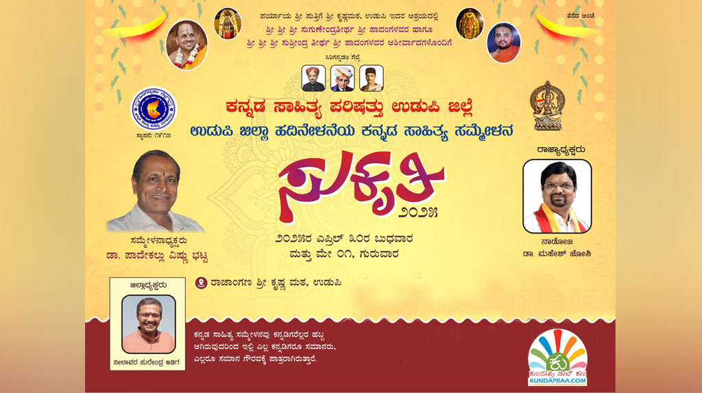 ಉಡುಪಿ: ಉಡುಪಿ ಜಿಲ್ಲಾ ಕನ್ನಡ ಸಾಹಿತ್ಯ ಪರಿಷತ್ತು ಇದರ ಉಡುಪಿ ಜಿಲ್ಲಾ ಹದಿನೇಳನೆಯ ಕನ್ನಡ ಸಾಹಿತ್ಯ ಸಮ್ಮೇಳನ – ‘ಸುಕೃತಿ 2025’ ಉಡುಪಿ ಶ್ರೀ ಕೃಷ್ಣ ಮಠದ ರಾಜಾಂಗಣದಲ್ಲಿ ಎಪ್ರಿಲ್ 30ರ ಬುಧವಾರ ಹಾಗೂ ಮೇ 01ರ ಗುರುವಾರದಂದು ನಡೆಯಲಿದೆ. ವಿದ್ವಾಂಸ, ನಿವೃತ್ತ ಪ್ರಾಚಾರ್ಯ ಡಾ. ಪಾದೇಕಲ್ಲು ವಿಷ್ಣು ಭಟ್ಟ ಅವರ ಸಮ್ಮೇಳನಾಧ್ಯಕ್ಷತೆಯಲ್ಲಿ, ಉಡುಪಿ ಪರ್ಯಾಯ ಶ್ರೀ ಪುತ್ತಿಗೆ ಶ್ರೀ ಕೃಷ್ಣ ಮಠದ ಆಶ್ರಯದಲ್ಲಿ ಈ ಭಾರಿಯ ಸಾಹಿತ್ಯ ಸಮ್ಮೇಳನ ಎರಡು ದಿನಗಳ ಕಾಲ ಜರುಗಲಿದೆ.