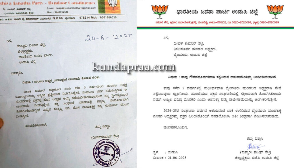 ಕಳೆದ 5 ವರ್ಷಗಳಿಂದ ಮಂಡಲ ಅಧ್ಯಕ್ಷ ಜವಾಬ್ದಾರಿಯನ್ನು ಶ್ರದ್ಧೆಯಿಂದ ನಿರ್ವಹಿಸಿದ್ದೇನೆ. ಸಂಘಟನಾ ಪರ್ವ ನಡೆಯುತ್ತಿರುವ ಈ ಸಂದರ್ಭದಲ್ಲಿ ಪಕ್ಷದಲ್ಲಿ ಹೊಸ ಅಧ್ಯಕ್ಷರ ಆಯ್ಕೆ ನಡೆಯಬೇಕಾಗಿರುವುದರಿಂದ ಸ್ವ-ಇಚ್ಛೆಯಿಂದ ರಾಜೀನಾಮೆ ನೀಡುತ್ತಿದ್ದೇನೆ. ಹೊಸ ನಾಯಕತ್ವಕ್ಕೆ ಸಂಪೂರ್ಣ ಬೆಂಬಲ ನೀಡುತ್ತೇನೆ ಎಂದು ಅವರು ತಮ್ಮ ರಾಜೀನಾಮೆ ಪತ್ರದಲ್ಲಿ ತಿಳಿಸಿದ್ದಾರೆ.