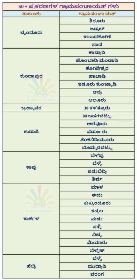 ಶಿರೂರು, ಜಡ್ಕಲ್, ಕಂಬದಕೋಣೆ, ನಾಡ, ಕಾವ್ರಾಡಿ, ಹೊಂಬಾಡಿ ಮಂಡಾಡಿ, ಕೋಟೇಶ್ವರ, ಹಾಲಾಡಿ, ಇಡೂರು ಕುಂಜ್ಞಾಡಿ, ಆಜ್ರಿ, ಆಲೂರು, 38 ಕಳತ್ತೂರು, 80 ಬಡಗಬೆಟ್ಟು, ಅಲೆವೂರು, ಪೆರ್ಡೂರು, ತೆಂಕನಿಡಿಯೂರು, ಬೊಮ್ಮರಬೆಟ್ಟು, ಬೆಳಪು, ಬೆಳ್ಳೆ, ಪಡುಬಿದ್ರಿ, ಶಿರ್ವ, ಮಾಳ, ಈದು, ಕುಕ್ಕುಂದೂರು, ಕಡ್ತಲ, ಮರ್ಣೆ, ಪಳ್ಳಿ, ನಿಟ್ಟೆ, ಮಿಯಾರು, ಬೆಳ್ಮಣ್, ಬೆಳ್ವೆ, ಮುದ್ರಾಡಿ, ವರಂಗ