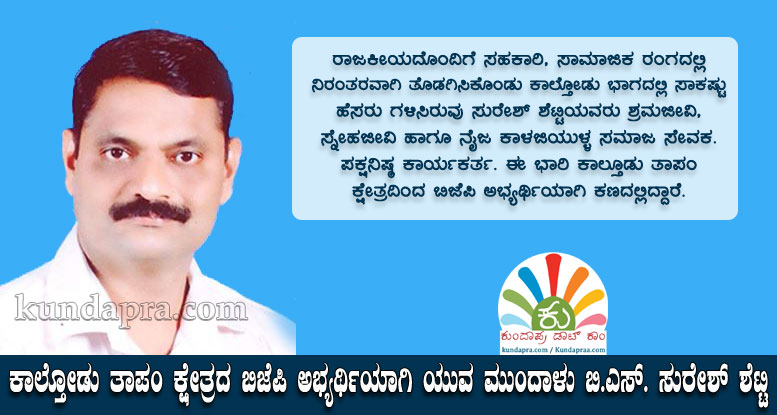 ಬೈಂದೂರು: ಕುಂದಾಪುರ ತಾಲೂಕು ಪಂಚಾಯತ್ನ ಕಾಲ್ತೋಡು ತಾಪಂ ಕ್ಷೇತ್ರದ ಬಿಜೆಪಿ ಅಭ್ಯರ್ಥಿಯಾಗಿ ಕಾಲ್ತೋಡು ಗ್ರಾಮ ಪಂಚಾಯತ್ನ ಮಾಜಿ ಅಧ್ಯಕ್ಷ ಬಿ.ಎಸ್. ಸುರೇಶ್ ಶೆಟ್ಟಿ ಸ್ವರ್ಧಾ ಕಣದಲ್ಲಿದ್ದಾರೆ.