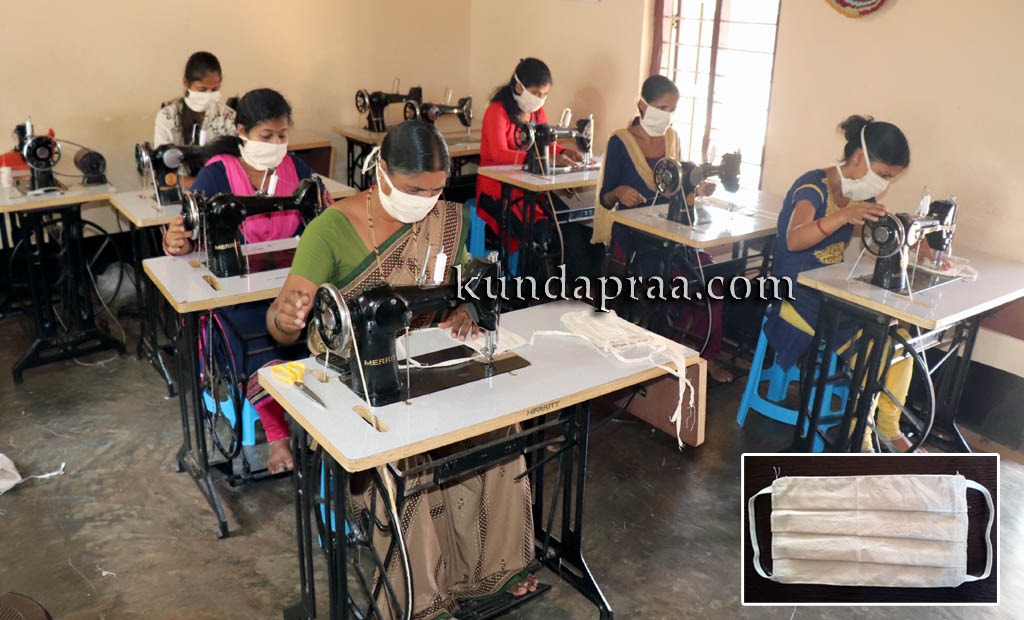 ಕುಂದಾಪುರ: ಎಲ್ಲಡೆ ಲಾಕ್ಡೌನ್ ಜಾರಿಯಾಗಿ ಕೊರೋನಾ ವಿರುದ್ಧ ಹೋರಾಟಕ್ಕಿಳಿದ ಸಂದರ್ಭ ವಂಡ್ಸೆ ಗ್ರಾಮ ಪಂಚಾಯತಿಯ ಸ್ವಾವಲಂಬನಾ ಕೇಂದ್ರದ ಮಹಿಳೆಯರೂ ಇದಕ್ಕೆ ಸಾಥ್ ನೀಡಿದ್ದಲ್ಲದೇ ಸಾವಿರಾರು ಬಟ್ಟೆಯ ಮಾಸ್ಕ್ಗಳನ್ನು ತಯಾರಿಸಿ ಆದಾಯಕ್ಕೊಂದು ದಾರಿ ಕಂಡುಕೊಂಡಿದ್ದರು.