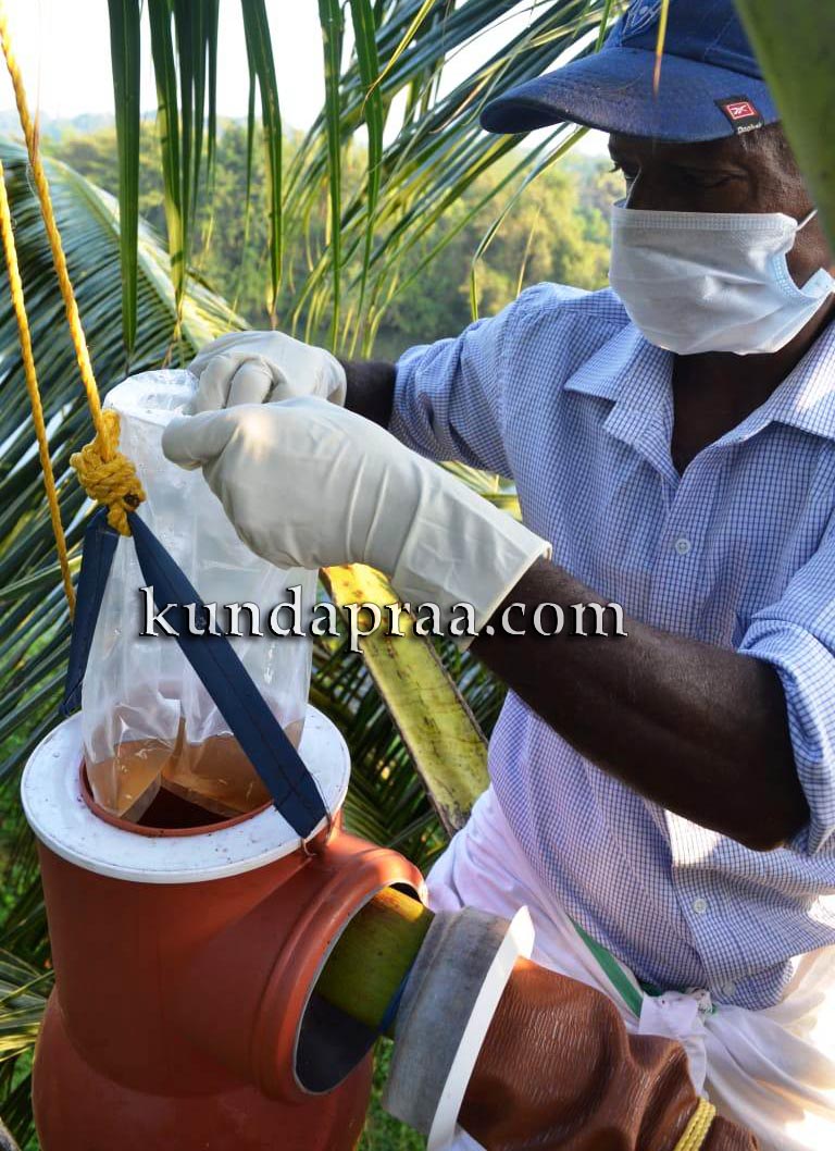 ಆರೋಗ್ಯ ಪೂರ್ಣ ತೆಂಗಿನ ಮರ ಆಯ್ಕೆ ಮಾಡಿದ ನಂತರ ಬಂದ ಹಿಂಗಾರಕ್ಕೆ ಒಂದೊಂದು ಇಂಚು ಅಂತರಲ್ಲಿ ಕಟ್ಟು ಹಾಕಿ ಹಿಂಗಾರದ ತುದಿ ಕತ್ತಿಯಿಂದ ಸವರಲಾಗುತ್ತದೆ. 8 ದಿನ ಹೀಗೆ ಮಾಡಿ, ನಂತರ ಕೆಳಗೆ ಐಸ್ ಇರುವ ಬಾಕ್ಸ್ ಇಟ್ಟು ಹಿಂಗಾರದ ನೀರು ಪ್ಲಾಸ್ಟಿಕ್ ಕೊಟ್ಟಿಯಲ್ಲಿ ಶೇಖರಣೆವಾಗುವಂತೆ ಕಟ್ಟಿ, ಸಂಗ್ರಹವಾದ ನೀರು ದಿನದಲ್ಲಿ ಎರಡು ಬಾರಿ ಸಂಗ್ರಹಿಸಿ ಬಾಟಲಿಯಲ್ಲಿ ಸಂಗ್ರಹಸಿ ಮಾರುಕಟ್ಟಿಗೆ ಬಿಡುಗಡೆ ಮಾಡಲಾಗುತ್ತದೆ/ಕುಂದಾಪ್ರ ಡಾಟ್ ಕಾಂ ವರದಿ /