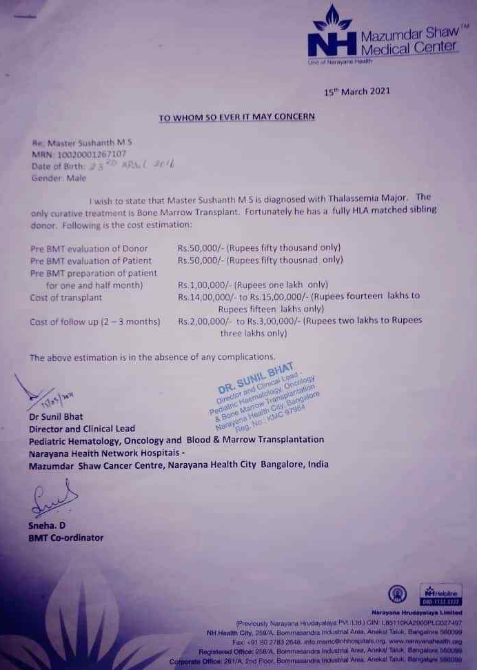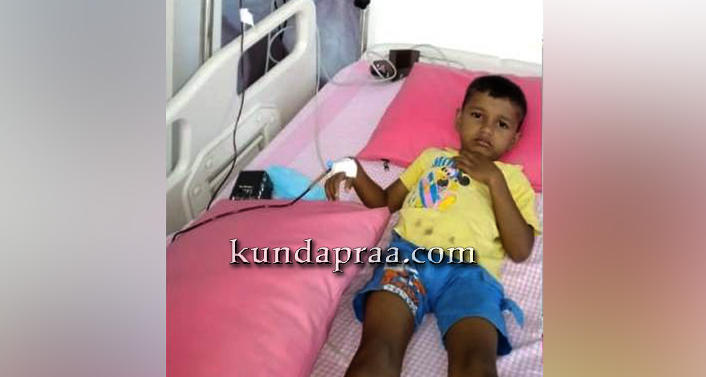 ಕುಂದಾಪುರ: ಗೋಳಿಹೋಳೆ ಗ್ರಾಮದ ಮಾವಿನಮನೆ ಮಂಜುನಾಥ ನಾಯ್ಕ್ ಅವರ ಮಗನಾದ 4 ವರ್ಷದ ಸುಶಾಂತ್ ಕಳೆದ ನಾಲ್ಕು ವರ್ಷದಿಂದ ಥಲಸ್ಸಿಮಿಯಾ ಮೇಜರ್ ಎಂಬಂತಹ ಅಪರೂಪದ ಖಾಯಿಲೆಗೆ ತುತ್ತಾಗಿದ್ದಾನೆ. ಇತ್ತಿಚೆಗೆ ತಪಾಸಣೆ ನಡೆಸಿದ ಬೆಂಗಳೂರಿನ ನಾರಾಯಣ ಹೃದಯಾಲದ ವೈದ್ಯರು ಬೋನ್ ಮ್ಯಾರೋ ಟ್ರಾಸ್ಪರೇಂಟ್ ಎನ್ನುವ ಶಸ್ತ್ರಚಿಕಿತ್ಸೆ ಮಾಡಿಸಬೇಕೆಂದು ಹಾಗೂ ಈ ಚಿಕಿತ್ಸೆಯ 30 ಲಕ್ಷ ರೂ. ವೆಚ್ಚವಾಗುವುದಾಗಿಯೂ ತಿಳಿಸಿದ್ದಾರೆ.