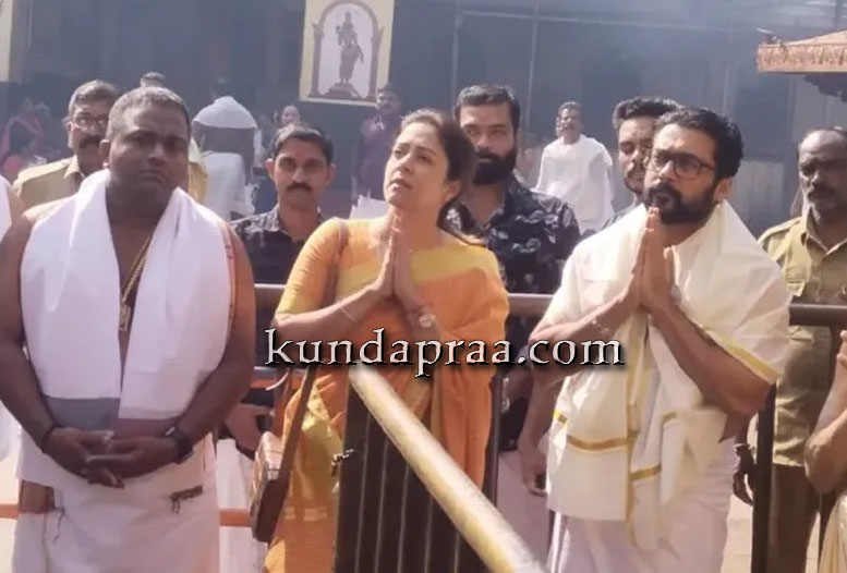ಕೊಲ್ಲೂರು: ಇಲ್ಲಿನ ಶ್ರೀ ಮೂಕಾಂಬಿಕಾ ದೇವಳಕ್ಕೆ ತಮಿಳು ಚಿತ್ರರಂಗದ ಖ್ಯಾತ ಸ್ಟಾರ್ ದಂಪತಿ ಸೂರ್ಯ ಹಾಗೂ ಜ್ಯೋತಿಕಾ ಭೇಟಿ ನೀಡಿ ದೇವರ ದರ್ಶನ ಪಡೆದರು.