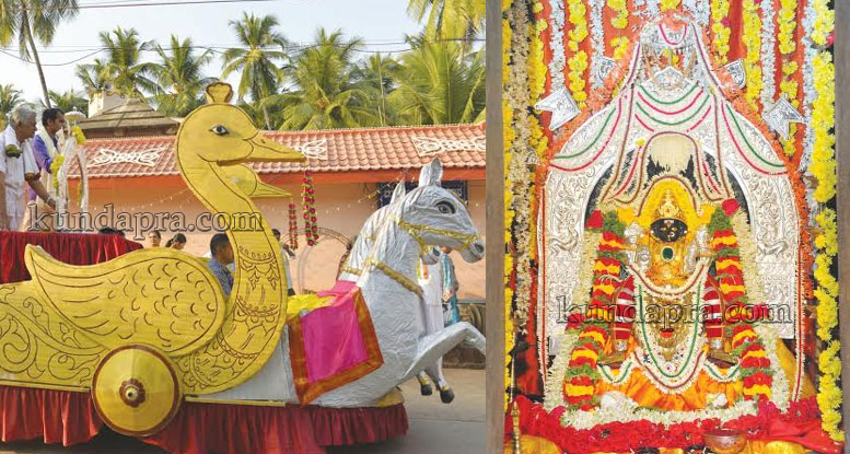 ವೈಭವದ ಮೆರವಣಿಗೆ : ಶ್ರೀ ಬಗಳಾಂಬ ತಾಯಿಗೆ ಸಮರ್ಪಿಸಲಾದ ರಜತ ಪ್ರಭಾವಳಿಯನ್ನು ವಿದ್ಯುಕ್ತವಾಗಿ ಸಕಲ ಮಂಗಳವಾದ್ಯ ಘೋಷಗಳೊಂದಿಗೆ ಸಂಭ್ರಮ ಸಡಗರದಿಂದ ಬರಮಾಡಿಕೊಳ್ಳಲಾಯಿತು. ಪೂರ್ಣಕುಂಭ ಹಿಡಿದು ಸಾಗುವ ಮಹಿಳೆಯರ ದಂಡು, ಚಂಡೆವಾದನ ಮೆರವಣಿಗೆಗೆ ಮೆರಗು ನೀಡಿದವು. ಕುಂದಾಪುರದ ಮಾಸ್ತಿಕಟ್ಟೆಯಿಂದ ಆರಂಭಗೊಂಡ ಮೆರವಣಿಗೆಯು ಸುಂದರವಾಗಿ ಅಲಂಕರಿಸಿದ ತೆರೆದ ವಾಹನದಲ್ಲಿ ರಜತ ಪ್ರಭಾವಳಿಯನ್ನು ಇರಿಸಿ ದೇವಳಕ್ಕೆ ತರಲಾಯಿತು. ದೇವಳವನ್ನು ತಳಿರು ತೋರಣಗಳಿಂದ ಸಿಂಗರಿಸಲಾಗಿದ್ದು, ಎಲ್ಲಡೆಯೂ ಸಂಭ್ರಮದ ವಾತಾವರಣ ಮೂಡಿದ್ದು, ಭಕ್ತಿ ಭಾವದಿಂದ ಧಾರ್ಮಿಕ ಕಾರ್ಯಕ್ರಮದಲ್ಲಿ ಭಕ್ತರು ಪಾಲ್ಗೊಂಡರು.