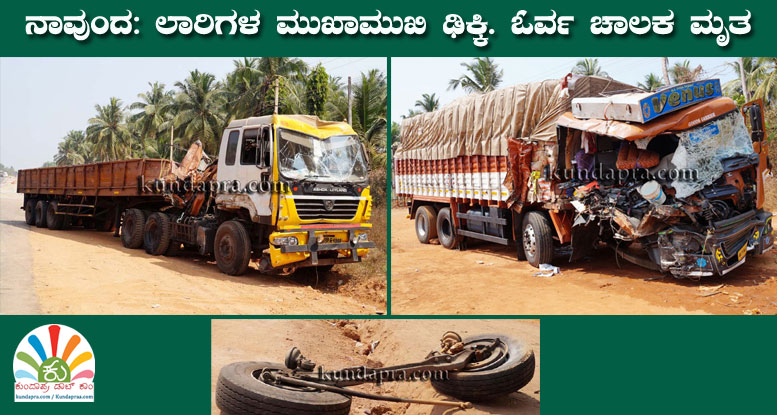 ಭಟ್ಕಳ ಕಡೆಯಿಂದ ಕುಂದಾಪುರ ಮಾರ್ಗವಾಗಿ ಸಾಗುತ್ತಿದ್ದ ಕಬಿಣ್ಣದ ಸರಳು ತಂಬಿದ್ದ ಲಾರಿ ಹಾಗೂ ಭಟ್ಕಳ ಮಾರ್ಗವಾಗಿ ಸಾಗುತ್ತಿದ್ದ ಔಷಧಿ ಸಾಗಾಟದ ಲಾರಿಯ ನಾವುಂದದ ವಿನಾಯಕ ಹೋಟೆಲ್ ಬಳಿಯ ರಾಷ್ಟೀಯ ಹೆದ್ದಾರಿಯಲ್ಲಿ ಮುಖಾಮುಖಿ ಢಿಕ್ಕಿಯಾಗಿತ್ತು. ಅಫಘಾತದ ತೀವ್ರತೆಗೆ ಎರಡೂ ಲಾರಿಗಳು ಸಂಪೂರ್ಣ ಜಖಂಗೊಂಡು, ಔಷಧಿ ತುಂಬಿದ ಲಾರಿಯ ಚಾಲಕ ಸ್ಥಳದಲ್ಲಿಯೇ ಮೃತಪಟ್ಟಿದ್ದರು. ಮತ್ತೊಂದು ಲಾರಿಯ ಚಾಲಕ, ಕ್ಲೀನರ್ಗಳು ಗಾಯಗೊಂಡಿದ್ದರು. ಕುಂದಾಪ್ರ ಡಾಟ್ ಕಾಂ ಸುದ್ದಿ
