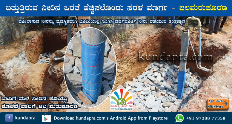 ಕುಂದಾಪುರ, 2016 Apl 5th: ನೀರಿನ ಸಮಸ್ಯೆ ನೀಗಿಸಲು ಬಾವಿ, ಕೊಳವೆ ಬಾವಿಯನ್ನು ನಿರ್ಮಿಸಿದ್ದಾಯ್ತು. ಆದರೆ ಅದರಲ್ಲೂ ನೀರು ಬತ್ತುತ್ತಿದೆ! ನೀರು ಬೇಕಲ್ಲ ಇನ್ನೇನು ಮಾಡೊದು ಎಂದು ಯೋಚಿಸುತ್ತಾ ಕುಳಿತವರಿಗೊಂದು ಹೊಸತೊಂದು ಒರತೆ ಮೂಡಿದೆ. ಕಡಿಮೆ ಖರ್ಚಿನಲ್ಲಿ ಅಂತರ್ಜಲವನ್ನು ಹೆಚ್ಚಿಸುವ ಕಾರ್ಯವನ್ನು ಕೈತ್ತಿಕೊಳ್ಳುವ ಮೂಲಕ ವರ್ಷಪೂರ್ತಿ ಹೇರಳ ನೀರು ಪಡೆಯಲು ತಂತ್ರಜ್ಞಾನವೊಂದು ಉಡುಪಿ ಜಿಲ್ಲೆಯಲ್ಲಿ ಮೊದಲ ಬಾರಿಗೆಂಬಂತೆ (2016) ಅನುಷ್ಠಾನಗೊಂಡಿದೆ.