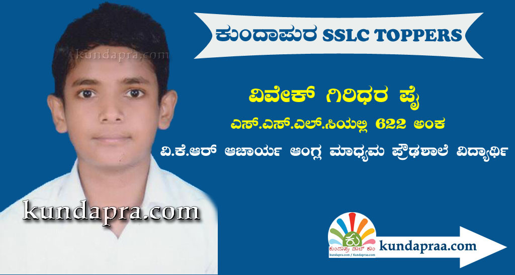 ಕುಂದಾಪುರ: ಕುಂದಾಪುರ ಎಜುಕೇಶನ್ ಸೊಸೈಟಿಯ ಪ್ರವರ್ತಿತ ವಿ.ಕೆ.ಆರ್. ಆಚಾರ್ಯ ಸ್ಮಾರಕ ಆಂಗ್ಲ ಮಾಧ್ಯಮ ಪ್ರೌಢಶಾಲೆಯ ವಿದ್ಯಾರ್ಥಿ ಎಚ್. ವಿವೇಕ್ ಗಿರಿಧರ ಪೈ ಎಸ್ಎಸ್ಎಲ್ಸಿ ಪರೀಕ್ಷೆಯಲ್ಲಿ 625ರಲ್ಲಿ 622ಅಂಕ ಪಡೆದು ವಿಶಿಷ್ಟ ಶ್ರೇಣಿಯಲ್ಲಿ ತೇರ್ಗಡೆ ಹೊಂದಿದ್ದಾರೆ. ರಾಜ್ಯ ಸಾರಿಗೆ ಸಂಸ್ಥೆಯಲ್ಲಿ ಅಧಿಕಾರಿಯಾಗಿರುವ ಹೆಚ್. ಗಿರಿಧರ ಪೈ ಹಾಗೂ ಕುಂದಾಪುರ ಭಂಡಾರ್ಕಾರ್ಸ್ಕಾಲೇಜಿನ ಪ್ರಾಧ್ಯಾಪಕಿ ಪ್ರೊ. ಗಾಯತ್ರಿ ಗಿರಿಧರ್ ಪೈ ಅವರ ಮಗನಾದ ವಿವೇಕ್ ಅತ್ಯಧಿಕ ಅಂಕಗಳ ಪಡೆದು ಶಾಲೆಗೆ ಪ್ರಥಮ ಸ್ಥಾನಿಯಾಗಿದ್ದಾನೆ. ಕುಂದಾಪ್ರ ಡಾಟ್ ಕಾಂ ಸುದ್ದಿ.