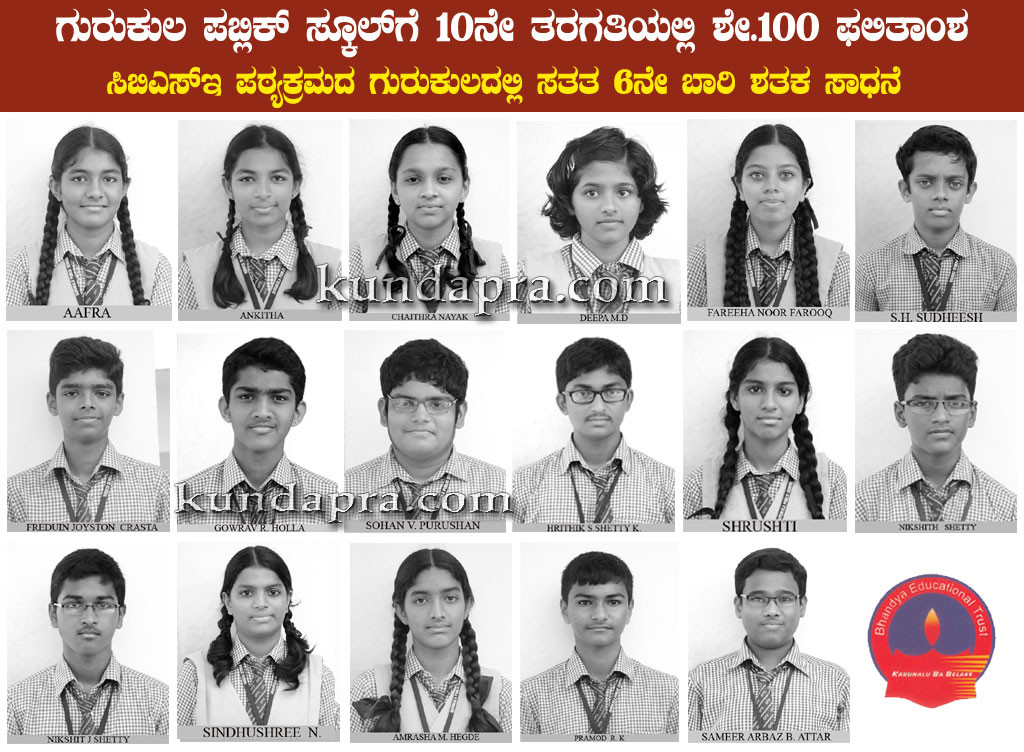 ಕುಂದಾಪುರ: ಪ್ರತಿಷ್ಠಿತ ಕೋಟೆಶ್ವರ ವಕ್ವಾಡಿಯಲ್ಲಿನ ಗುರುಕುಲ ಪಬ್ಲಿಕ್ ಶಾಲೆಯ 10ನೇ ತರಗತಿ ಸಿ.ಬಿ.ಎಸ್.ಇ ಪಠ್ಯಕ್ರಮದ ವಿದ್ಯಾರ್ಥಿಗಳು ಸತತ 6ನೇ ಬಾರಿಗೆ ಶೇ.100 ಫಲಿತಾಂಶವನ್ನು ದಾಖಲಿಸಿದ್ದಾರೆ. ಪ್ರಸಕ್ತ ಸಾಲಿನಲ್ಲಿ 64ವಿದ್ಯಾರ್ಥಿಗಳು ಪರೀಕ್ಷೆಯಲ್ಲಿ ಹಾಜರಾಗಿದ್ದು 13 ವಿದ್ಯಾರ್ಥಿಗಳು 10 ಸಿ.ಜಿ.ಪಿ.ಎ (ಅತ್ಯುನ್ನತ ಶ್ರೇಣಿ), 17 ವಿದ್ಯಾರ್ಥಿಗಳು 9 ಸಿ.ಜಿ.ಪಿ.ಎ ಮೇಲ್ಪಟ್ಟು ವಿಶಿಷ್ಠ ಶ್ರೇಣಿಯಲ್ಲಿ, ಹಾಗೂ ಹಾಜರಾದ ವಿದ್ಯಾರ್ಥಿಗಳು ಪ್ರಥಮ ಶ್ರೇಣಿಯಲ್ಲಿ ಉತ್ತೀರ್ಣರಾಗಿ ಶಾಲೆಗೆ ಕೀರ್ತಿಯನ್ನು ತಂದಿರುತ್ತಾರೆ.