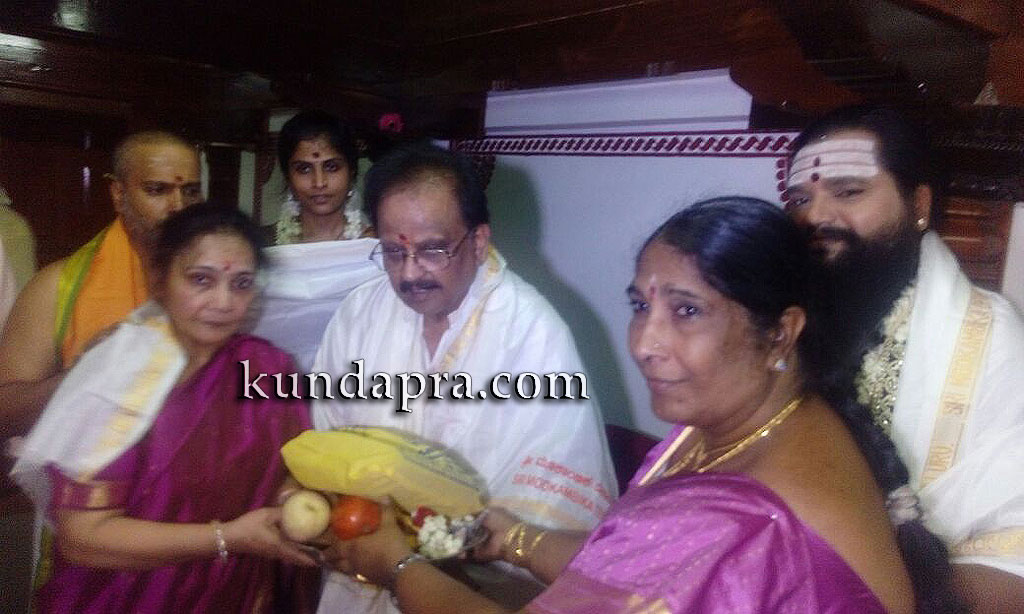 ಕೊಲ್ಲೂರು: ದಕ್ಷಿಣ ಭಾರತದ ಖ್ಯಾತ ಪಂಚಭಾಷಾ ಗಾಯಕ ಎಸ್.ಪಿ. ಬಾಲಸುಬ್ರಹ್ಮಣ್ಯಂ ಕುಟುಂಬಿಕರು ಹಾಗೂ ಮಹರ್ಷಿ ಆನಂದ ಗುರೂಜಿ ಕೊಲ್ಲೂರಿಗೆ ಭೇಟಿ ನೀಡಿ ಶ್ರೀ ಮೂಕಾಂಬಿಕೆಯ ದರ್ಶನ ಪಡೆದರು. ಎಸ್.ಪಿ. ಬಾಲಸುಬ್ರಹ್ಮಣ್ಯಂ ಅವರ ಪತ್ನಿ, ಪುತ್ರ ಹಾಗೂ ಸೊಸೆ ಕ್ಷೇತ್ರದಲ್ಲಿ ದೇವಿಗೆ ವಿಶೇಷ ಪೂಜೆ ಸಲ್ಲಿಸಿ ಮರಳಿದರು. ದೇವಳದ ಕಾರ್ಯನಿರ್ವಹಣಾಧಿಕಾರಿ ಟಿ. ಆರ್. ಉಮ, ಸಹಾಯಕ ಕಾರ್ಯನಿರ್ವಹಣಾಧಿಕಾರಿ ಎಚ್. ಕೃಷ್ಣಮೂರ್ತಿ ಗೌರವಿಸಿದರು.