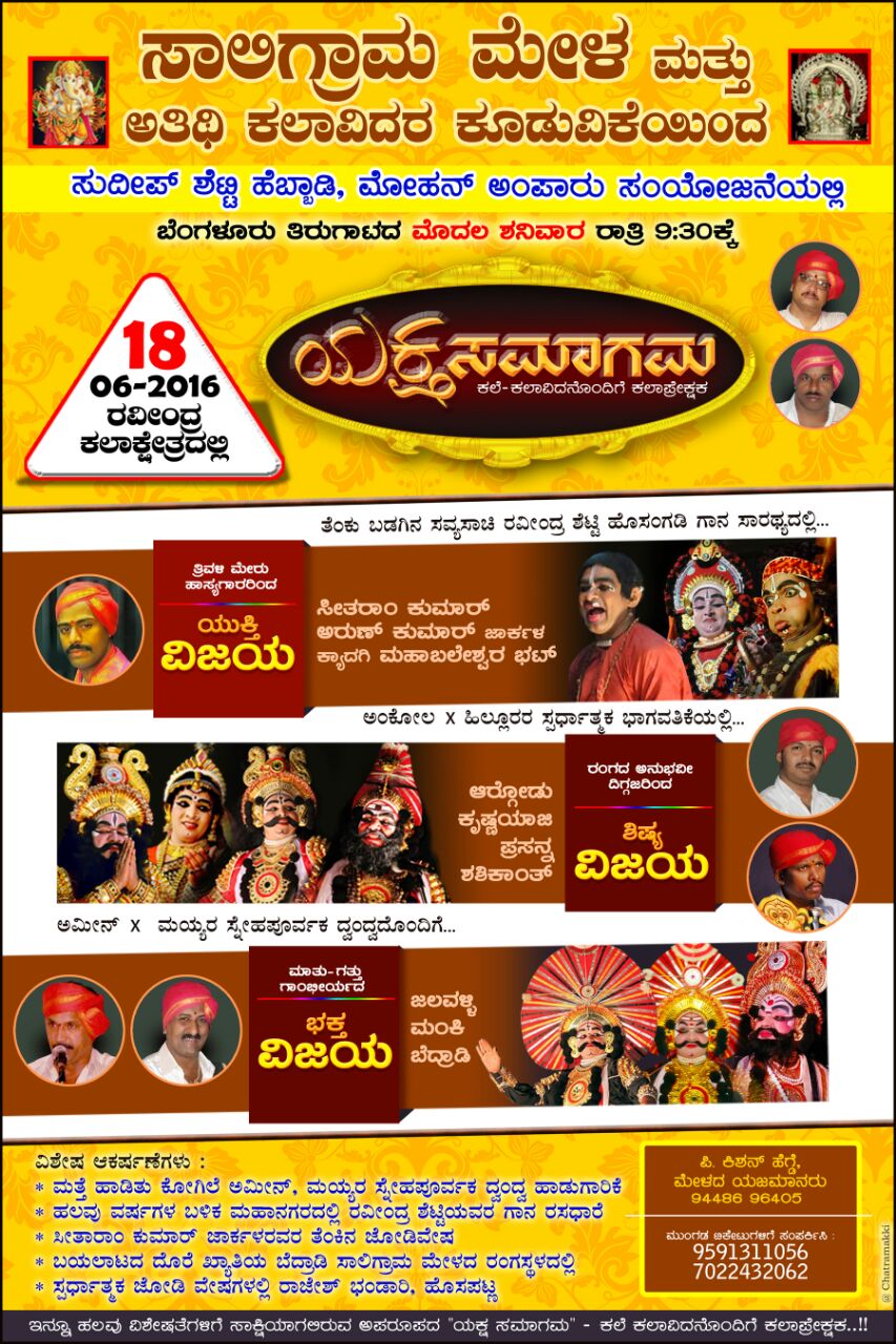 ಬೆಂಗಳೂರು: ಮಳೆಗಾಲದಲ್ಲಿ ಬೆಂಗಳೂರಿನಲ್ಲಿ ನೆಲೆಸಿರುವ ಕರಾವಳಿಗರಿಗೆ ಯಕ್ಷರಸವನ್ನು ಸವಿಯುವ ಸದಾವಕಾಶ ಸಾಕಷ್ಟು ಒದಗಿ ಬರುತ್ತಿದೆ. ಜೂನ್. 18ರ ಶನಿವಾರ ಬೆಂಗಳೂರಿನ ಕಲಾಕ್ಷೇತ್ರದಲ್ಲಿ ಸಾಲಿಗ್ರಾಮ ಮೇಳ ಹಾಗೂ ಅತಿಥಿ ಕಲಾವಿದರ ಕೂಡುವಿಕೆಯಲ್ಲಿ ಯಕ್ಷ ಸಮಾಗಮ ನಡೆಯಲಿದೆ.
