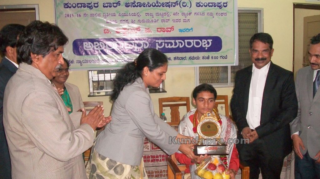 ಕುಂದಾಪುರ ಹೆಚ್ಚುವರಿ ಜಿಲ್ಲಾ ಸತ್ರ ನ್ಯಾಯಾಲಯದ ನ್ಯಾಯಾಧೀಶ ರಾಜಶೇಖರ ವಿ. ಪಾಟೀಲ್ ಸನ್ಮಾನಿಸಿ ಮಾತನಾಡಿದರು. ಕುಂದಾಪುರ ಬಾರ್ ಅಸೋಸಿಯೇಶನ್ ಅಧ್ಯಕ್ಷ ಬನ್ನಾಡಿ ಸೋಮನಾಥ ಹೆಗ್ಡೆ ಅಧ್ಯಕ್ಷತೆ ವಹಿಸಿ ಪ್ರಾಸ್ತಾವಿಕ ಮಾತುಗಳನ್ನಾಡಿದರು. ಹಿರಿಯ ಸಿವಿಲ್ ನ್ಯಾಯಾಧೀಶ ಶೀನಿವಾಸ ಸುವರ್ಣ, ನ್ಯಾಯಾಧೀಶರಾದ ಪ್ರೀತ್ ಜೆ, ಲಾವಣ್ಯ ಚಂದ್ರಶೇಖರ್ ಬಣಕಾರ್ ಉಪಸ್ಥಿತರಿದ್ದರು. ಕಾರ್ಯದರ್ಶಿ ರವೀಂದ್ರ ಶೆಟ್ಟಿ ವಂದಿಸಿದರು. ಸಂತೋಷ್ ವಿದ್ಯಾರ್ಥಿಯ ಪರಿಚಯ ಪತ್ರ ವಾಚಿಸಿದರು. ನ್ಯಾಯವಾದಿ ರಾಘವೇಂದ್ರ ಚರಣ ನಾವಡ ಕಾರ್ಯಕ್ರಮ ನಿರ್ವಹಿಸಿದರು.