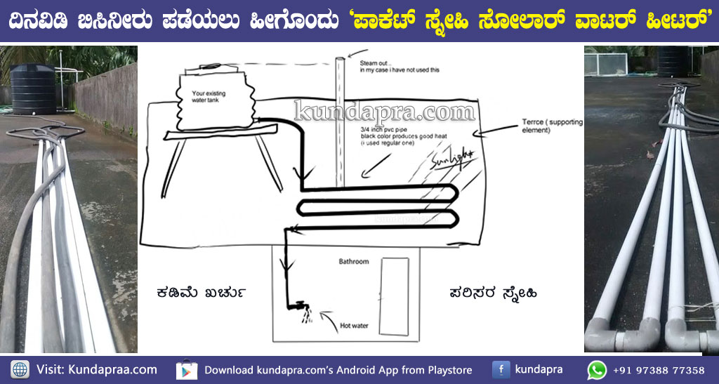 ಕುಂದಾಪುರ: ಬಿಸಿನೀರಿನಿಂದ ಸ್ನಾನ ಮಾಡಲು ಕಟ್ಟಿಗೆಯನ್ನು ತಂದು ಹಂಡೆ ಬಿಸಿ ಮಾಡಬೇಕೆಂದಿಲ್ಲ. ಸಾವಿರಾರು ರೂಪಾಯಿ ತೆತ್ತು ಗ್ಯಾಸ್ ಗ್ಲಿಝರಿನ್, ಸೋಲಾರ್ ವಾಟರ್ ಹೀಟರ್ಗೆ ಮೊರೆ ಹೋಗಬೇಕೆಂದೂ ಇಲ್ಲ. ಒಂದು ಭಾರಿ ಅತಿ ಕಡಿಮೆ ಬಂಡವಾಳ ವಿನಿಯೋಗಿಸಿದರೆ ಸಾಕು. ಸೌರ ಶಕ್ತಿಯನ್ನು ಉಪಯೋಗಿಸಿಕೊಂಡು ನಿಮ್ಮ ಮನೆ, ಹೋಟೆಲ್ಗಳಿಗೆ ದಿನವಿಡಿ ಸುಲಭವಾಗಿ ಬಿಸಿನೀರು ಪಡೆದುಕೊಳ್ಳುವ ಸರಳ ತಂತ್ರಜ್ಞಾನವನ್ನು ನೀವೆ ಅಳವಡಿಸಿಕೊಳ್ಳಬಹುದು!