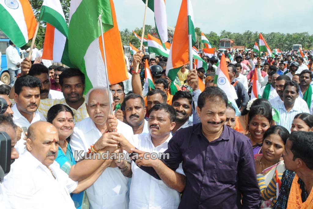 ಶನಿವಾರ ಹೆಮ್ಮಾಡಿ ಜಯಶ್ರಿ ಸಭಾಂಗಣದಲ್ಲಿ ಜರುಗಿದ ಬೈಂದೂರು ವಿಧಾನಸಭಾ ಕ್ಷೇತ್ರ ವ್ಯಾಪ್ತಿಯ ಭಾರತೀಯ ಜನತಾ ಪಕ್ಷದ ಕಾರ್ಯಕರ್ತರ ಸಮಾವೇಶ, ಮಂಡಲಗಳ ಪದಗ್ರಹಣ ಹಾಗೂ ಬೈಂದೂರು ತಿರಂಗಾ ಯಾತ್ರೆ ಬೈಕ್ ರ್ಯಾಲಿ ಸಮಾರೋಪ ಸಮಾರಂಭದಲ್ಲಿ ಮಾತನಾಡಿ ಸ್ವತಂತ್ರ ಭಾರತದ ಇತಿಹಾಸದಲ್ಲಿಯೇ ಮೊದಲ ಭಾರಿಗೆ ದೇಶಕ್ಕಾಗಿ ಪ್ರಾಣತ್ಯಾಗ ಮಾಡಿದ ಹುತಾತ್ಮರನ್ನು ಸ್ಮರಿಸಿ ಯುವಕರಲ್ಲಿ ಜಾಗೃತಿ ಮೂಡಿಸುವ ಉದ್ದೇಶದಿಂದ ದೇಶಾದಾದ್ಯಂತ ತಿರಂಗಾ ಯಾತ್ರೆ ಕಾರ್ಯಕ್ರಮವನ್ನು ಆಯೋಜಿಸಲು ಪ್ರಧಾನಿ ಮೋದಿ ಕರೆ ನೀಡಿದ್ದು ಎಲ್ಲೆಡೆಯೂ ಉತ್ತಮ ಪ್ರತಿಕ್ರಿಯೆ ದೊರೆತಿದೆ ಎಂದರು.