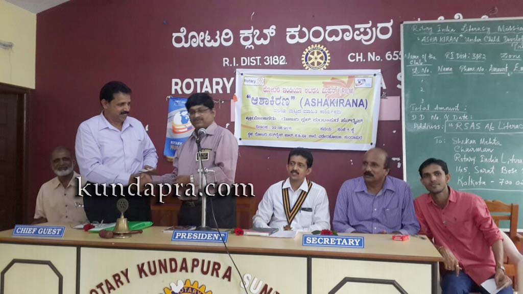 ಕುಂದಾಪುರ: ರೋಟರಿ ಇಂಡಿಯ ಲಿಟ್ರಸಿ ಮಿಷನ್ ಅಡಿಯಲ್ಲಿ ಆಶಾಕಿರಣ ಯೋಜನೆ ಅನ್ವಯ ರೋಟರಿ ಕ್ಲಬ್ ಕುಂದಾಪುರ ಸನ್ ರೈಸ್ ವತಿಯಿಂದ ನಡೆದ ಆಶಾಕಿರಣ ಯೋಜನೆಯ ವಲಯ ಮಟ್ಟದ ಮಾಹಿತಿ ಕಾರ್ಯಕ್ರಮದಲ್ಲಿ ನಿವೃತ್ತ ಶಿಕ್ಷಣಾಧಿಕಾರಿ ಗೋಪಾಲ ಶೆಟ್ಟಿ ಮಾತನಾಡಿ ರೂ.೨೧೦೦ ನೀಡಿ ಉತ್ತರ ಭಾರತದ ಒಂದು ಮಗುವನ್ನು ದತ್ತು ತೆಗೆದುಕೊಂಡು ಆ ಮಗುವಿನ ಉಜ್ವಲ ಭವಿಷ್ಯವನ್ನು ರೂಪಿಸುವ ಯೋಜನೆಯೇ ಆಶಾಕಿರಣ ಯೋಜನೆ ಎಂದರು.