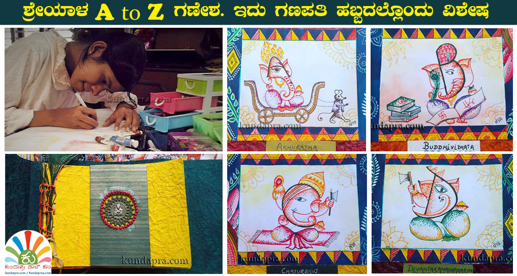 ಚಿತ್ರ ಕಲಾವಿದೆ, 11ನೇ ತರಗತಿಯ ಕಾಮರ್ಸ್ ವಿದ್ಯಾರ್ಥಿನಿ ಶ್ರೇಯಾಳ ಗಣಪತಿಯ ಪ್ರೀತಿಯೂ ಅಂತಹದ್ದೇ. ಪ್ರತಿ ಚೌತಿಯ ಸಮಯದಲ್ಲಿಯೂ ವಿಘ್ನನಿವಾರಕನನ್ನು ವಿವಿಧ ರೂಪದಲ್ಲಿ ಚಿತ್ರಿಸುತ್ತಿದ್ದ ಆಕೆ ಈ ಭಾರಿ ಗಣೇಶ ಹಬ್ಬದ ಸಲುವಾಗಿ ಆಂಗ್ಲ ಭಾಷೆಯ 26 ವರ್ಣಮಾಲೆಗನುಸಾರವಾಗಿ A ಯಿಂದ Z ಅಕ್ಷರ ಆರಂಭಗೊಳ್ಳುವ ಗಣಪತಿಯ ಹೆಸರುಗಳನ್ನು ಕಲೆಹಾಕಿ ಹೆಸರಿಗೆ ತಕ್ಕಂತೆ 26 ರೂಪಗಳಲ್ಲಿ ಗಣಪತಿಯನ್ನು ಚಿತ್ರಿಸಿದ್ದಾಳೆ.