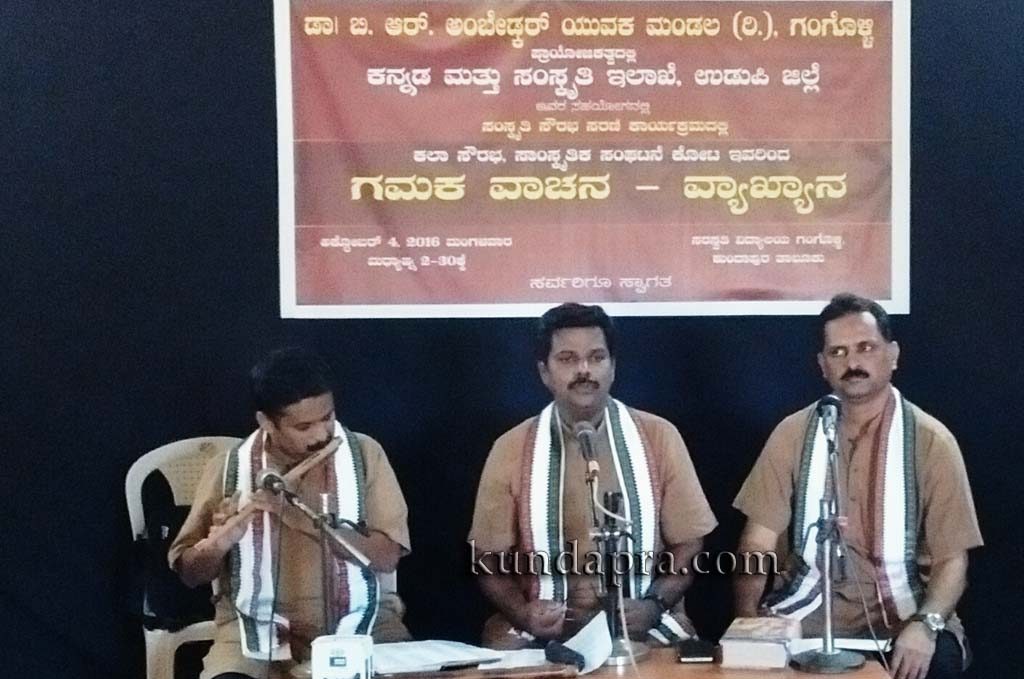 ಕುಂದಾಪ್ರ ಡಾಟ್ ಕಾಂ ಸುದ್ದಿ. ಗಂಗೊಳ್ಳಿ: ಶಿಕ್ಷಣವೆಂದರೆ ಕೇವಲ ನಾಲ್ಕು ಗೋಡೆಗಳ ಮಧ್ಯೆ ಕಲಿಯುವ ಪಾಠ ಪ್ರವಚನಗಳಲ್ಲ, ಪಠ್ಯಕ್ಕಿಂತ ಹೊರತಾದ ಅಮೂಲ್ಯ ಜೀವನ ಮೌಲ್ಯಗಳನ್ನು ರೂಢಿಸಿಕೊಳ್ಳಬೇಕಾದರೆ ಹತ್ತು ಹಲವು ಮುಖಗಳಲ್ಲಿ ನಮ್ಮನ್ನು ತೊಡಗಿಸಿಕೊಳ್ಳಬೇಕಾದ ಅನಿವಾರ್ಯತೆಯಿದೆ ಪುರಾಣ ಕಾವ್ಯಗಳ ಓದು ಮತ್ತು ಅಧ್ಯಯನ ವಿದ್ಯಾರ್ಥಿಗಳಲ್ಲಿ ನೈತಿಕವಾದ ಜಾಗೃತಿಯನ್ನುಂಟು ಮಾಡುತ್ತದೆ - ಎಂದು ಜಿ.ಎಸ್.ವಿ.ಎಸ್. ಅಸೋಸಿಯೇಶನ್ ಅಧ್ಯಕ್ಷರಾದ ಡಾ| ಕಾಶೀನಾಥ ಪೈ ಅಭಿಪ್ರಾಯ ವ್ಯಕ್ತಪಡಿಸಿದರು. ಡಾ| ಬಿ.ಆರ್. ಅಂಬೇಡ್ಕರ್ ಯುವಕ ಮಂಡಲ(ರಿ) ಗಂಗೊಳ್ಳಿ ಇವರು ಉಡುಪಿ ಜಿಲ್ಲಾ ಕನ್ನಡ ಮತ್ತು ಸಂಸ್ಕೃತಿ ಇಲಾಖೆಯ ಸಹಯೋಗದೊಂದಿಗೆ ಗಂಗೊಳ್ಳಿ ಸರಸ್ವತಿ ವಿದ್ಯಾಲಯದಲ್ಲಿ ಆಯೋಜಿಸಿದ ಗಮಕ-ವಾಚನ ವ್ಯಾಖ್ಯಾನ ಕಾರ್ಯಕ್ರಮವನ್ನು ದೀಪ ಬೆಳಗಿಸಿ ಉದ್ಘಾಟಿಸಿದರು.ಯುವಕ ಮಂಡಲದ ಅಧ್ಯಕ್ಷ ಕಿರಣ್ ಗಂಗೊಳ್ಳಿ ಕಾರ್ಯಕ್ರಮದ ಅಧ್ಯಕ್ಷತೆ ವಹಿಸಿದ್ದರು. ಉಪನ್ಯಾಸಕ ಸುಜಯೀಂದ್ರ ಹಂದೆ ಗಮಕದ ಹುಟ್ಟು, ಉದ್ದೇಶದ ಸ್ವರೂಪದ ಬಗೆಗೆ ಪ್ರಾಸ್ಥಾವಿಕ ಮಾತುಗಳನ್ನು ಆಡಿದರು. ಸರಸ್ವತಿ ವಿದ್ಯಾಲಯ ಪ್ರೌಢಶಾಲೆಯ ಪ್ರಭಾರ ಮುಖ್ಯೋಪಾಧ್ಯಾಯ ಸದಾನಂದ ವೈದ್ಯ ಉಪಸ್ಥಿತರಿದ್ದರು. ಯುವಕ ಮಂಡಲದ ಗೌರವಾಧ್ಯಕ್ಷ ಭಾಸ್ಕರ್ ಎಚ್. ಈ. ಸ್ವಾಗತಿಸಿ, ನಟರಾಜ್ ಕಾರ್ಯಕ್ರಮ ನಿರೂಪಿಸಿದರು. ಕೋಟದ ಕಲಾ ಸೌರಭ ಸಾಂಸ್ಕೃತಿಕ ಸಂಘಟನೆಯ ಕಲಾವಿದರಾದ ಸುಜಯೀಂದ್ರ ಹಂದೆ, ಉಪನ್ಯಾಸಕರಾದ ರಾಘವೇಂದ್ರ ತುಂಗ ಮತ್ತು ನಾಗೇಂದ್ರ ಐತಾಳ್ ಅವರು ’ಕುಮಾರವ್ಯಾಸ ಭಾರತದ’ ಕರ್ಣಾಂತರಂಗ ಎಂಬ ಭಾಗವನ್ನು ವಾಚಿಸಿ ವ್ಯಾಖ್ಯಾನಿಸಿದರು. ವರದಿ: ನರೇಂದ್ರ ಎಸ್ ಗಂಗೊಳ್ಳಿ.