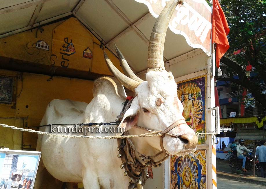 ಕುಂದಾಪ್ರ ಡಾಟ್ ಕಾಂ ಸುದ್ದಿ. ಕುಂದಾಪುರ: ಪಂಡರಾಪುರ ದಿಂದ ಹೊರಟ ದೇವ ಸ್ವರೂಪಿ ಎಂದೇ ಗುರುತಿಸಿಕೊಂಡ ಮೂರುಕಣ್ಣಿನ ಬಸವ ಹೆಸರು ಸೋಮನಾಥ. ೧೨ನೇ ಜೋತಿರ್ಲಿಂಗ ದರ್ಶನ ನಿಮಿತ್ತ ಪಂಡರಾಪುರದಿಂದ ಹೊರಟ ಬಸವ ನಾನಾಕಡೆ ಸಂಚರಿಸಿ, ಕುಂದಾಪುರಕ್ಕೆ ಆಗಮಿಸಿದೆ. ಮಿನಿ ಟೆಂಪೂದಲ್ಲಿ ಆಗಮಿಸಿದ ಬಸವನಿಗೆ ಗಗ್ಗರಗಳ ಶೃಂಗಾರವಿದ್ದು, ವಾಹನ ಹಿಂಮುಖವಾಗಿ ನಿಂತಿದ್ದಾನೆ. ನಡು ನೆತ್ತಿಮೇಲೆ ನೇರಕ್ಕೆ ಸಾಗಿದ ಒಂದು ಕೊಂಬಿದ್ದು, ಮತ್ತೆರಡು ಕೊಂಬುಗಳು ಮಾಮೂಲು ಎತ್ತಗಳಿಗೆ ಬರುವಹಾಗೆ ಇದೆ. ಎರಡು ಕಣ್ಣು ಮುಖದ ಇಕ್ಕೆಡೆಗಳಲ್ಲಿದ್ದರೆ, ಮೂರನೇ ಕಣ್ಣು ನೇರಕ್ಕೆ ಸಾಗಿದ ಕೊಂಬಿನ ಬದಿಯಲ್ಲಿದೆ. ಹದಿನಾಲ್ಕು ವರ್ಷದ ಪ್ರಾಯದ ಬಸವ ಸೌಮ್ಯ ಸ್ವರೂಪಿಯಾಗಿದ್ದು, ವಾಹನ ಸಂಚಾರದ ಸಮಯ ಅಲ್ಲಾಡದೇ ನಿಲ್ಲುತ್ತಾನೆ. ವೀಕ್ಷಕರು ಬಂದರೆ ತನ್ನ ಪಾಡಿಗೆ ತಾನಿದ್ದರೆ, ಭಕ್ತರು ಇದು ಈಶ್ವರನ ಅಪರವಾತರವಾಗಿದ್ದು, ನಂದಿ ಈಶ್ವರನ ಮೂರನೇ ಕಣ್ಣು ಹೊತ್ತು ಭೂಮಿಗೆ ಬಂದಿದ್ದಾನೆ ಎನ್ನುವ ಭಯ, ಭಕ್ತಿಯಿಂದ ನಮಿಸಿ, ಆಶೀರ್ವಾದ ಪಡೆಯುತ್ತಿದ್ದಾರೆ.